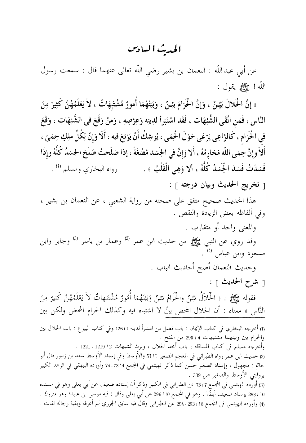 عَنِ النُّعمانِ بنِ بشيرٍ - رَضي الله عنهُما - قال: سَمِعتُ رَسُولَ اللهِ - صلى الله عليه وسلم - يقولُ: ((إنَّ الحَلالَ بَيِّنٌ وإنَّ الحَرَامَ بَيِّنٌ، وبَينَهُما أُمُورٌ مُشتَبهاتٌ، لا يَعْلَمُهنّ كثيرٌ مِن النَّاسِ، فَمَن اتَّقى الشُّبهاتِ استبرأ لِدينِهِ وعِرضِه، ومَنْ وَقَعَ في الشُّبُهاتِ وَقَعَ في الحَرَامِ، كالرَّاعي يَرعَى حَوْلَ الحِمَى يُوشِكُ أنْ يَرتَعَ فيهِ، ألا وإنَّ لِكُلِّ مَلِكٍ حِمًى، ألا وإنَّ حِمَى اللهِ محارِمُهُ، ألا وإنَّ في الجَسَدِ مُضغَةً إذا صلَحَتْ صلَحَ الجَسَدُ كلُّه، وإذَا فَسَدَت فسَدَ الجَسَدُ كلُّه، ألا وهِيَ القَلبُ)) رواهُ البُخاريُّ ومُسلمٌ (¬1) .