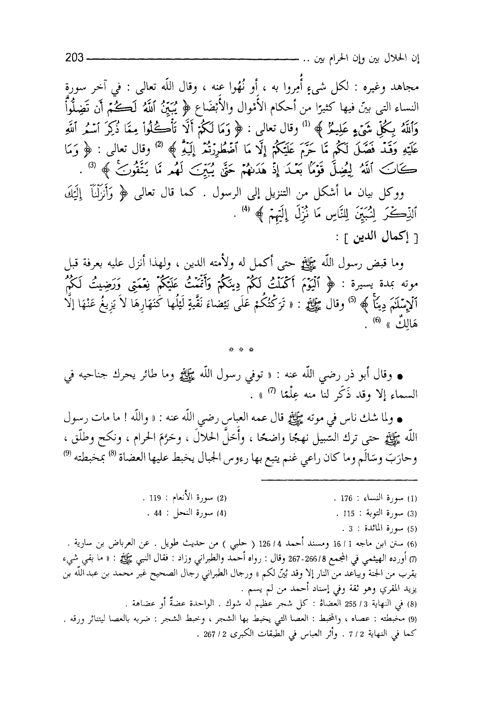 : {وَأَنْزَلْنَا إِلَيْكَ الذِّكْرَ لِتُبَيِّنَ لِلنَّاسِ مَا نُزِّلَ إِلَيْهِمْ} (¬6) وما قُبض - صلى الله عليه وسلم - حتّى أكمل له ولأُمته الدينَ، ولهذا أنزل عليه بعرفة قَبْلَ موته بمدة يسيرة: {الْيَوْمَ أَكْمَلْتُ لَكُمْ دِينَكُمْ وَأَتْمَمْتُ عَلَيْكُمْ نِعْمَتِي وَرَضِيتُ لَكُمُ الإسْلامَ دِيناً} (¬7) .