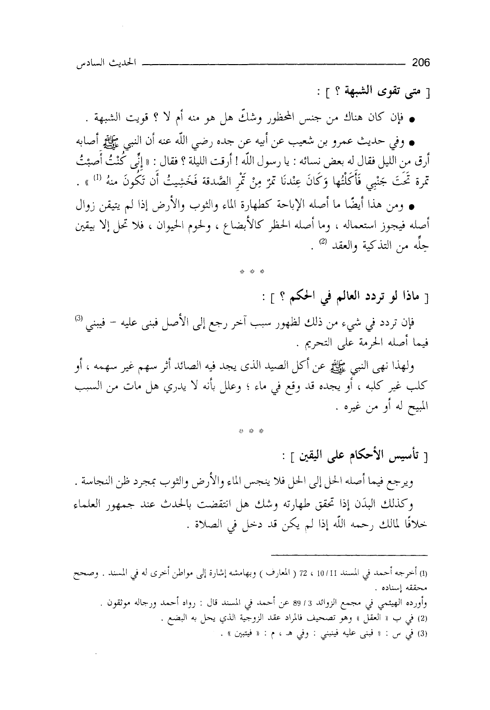ومن هذا أيضاً ما أصلهُ الإباحة كطهارة الماء، والثوب، والأرض إذا لم يتيقن زوال أصله، فيجوز استعمالُه، وما أصله الحظر كالأبضاع ولحوم الحيوان، فلا يحلُّ إلا بيقين حله من التذكية والعقد، فإنْ تردَّد في شيء من ذلك لظهور سبب آخر رجع إلى الأصل فبنى عليه، فيبني فيما أصله الحرمة على التحريم ولهذا نهى النَّبيُّ - صلى الله عليه وسلم - عن أكل الصيدِ الذي يجدُ فيه الصائد أثر سهمٍ غير سهمه، أو كلبٍ غير كلبهِ، أو يجده قد وقع في ماء (¬2) .