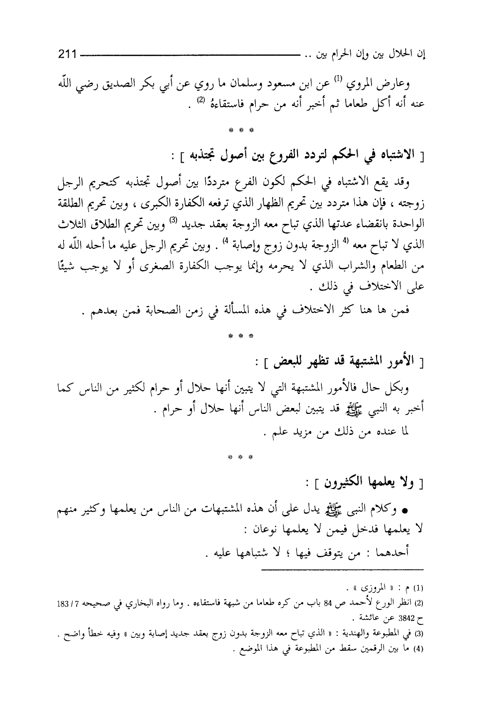 وبكل حال فالأمور المشتبهة التي لا تتبين أنَّها حلال ولا حرام لكثير من الناس، كما أخبر به النَّبيُّ - صلى الله عليه وسلم -، قد يتبيَّنُ لبعضِ النَّاس أنَّها حلال أو حرام، لما عِنده مِنْ ذلك من مزيدِ علمٍ (¬3) ، وكلام النَّبيِّ - صلى الله عليه وسلم - يدلُّ على أنَّ هذه المشتبهات مِنَ النَّاسِ من يعلمُها، وكثيرٌ منهم لا يعلمها، فدخل فيمن لا يعلمها نوعان: