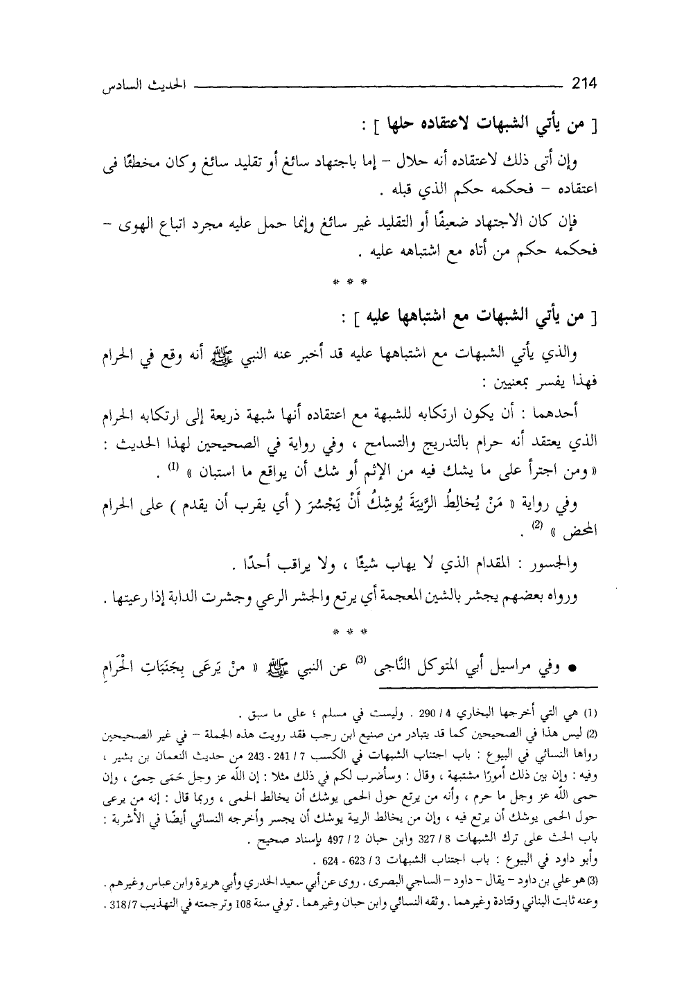 وإنْ أتى ذلك لاعتقاده أنَّه حلال، إمَّا باجتهادٍ سائغٍ، أو تقليدٍ سائغٍ، وكان مخطئاً في اعتقاده، فحكمهُ حكمُ الذي قبلَه، فإنْ كان الاجتهادُ ضعيفاً، أو التقليدُ غيرَ سائغٍ، وإنَّما حمل عليه مجرّد اتباع الهوى، فحكمُهُ حكمُ من أتاه مع اشتباهه عليه، والذي يأتي الشبهات مع اشتباهها عليه، فقد أخبر عنه النَّبيُّ - صلى الله عليه وسلم - أنَّه وقع في الحرام، وهذا يفسر بمعنيين: