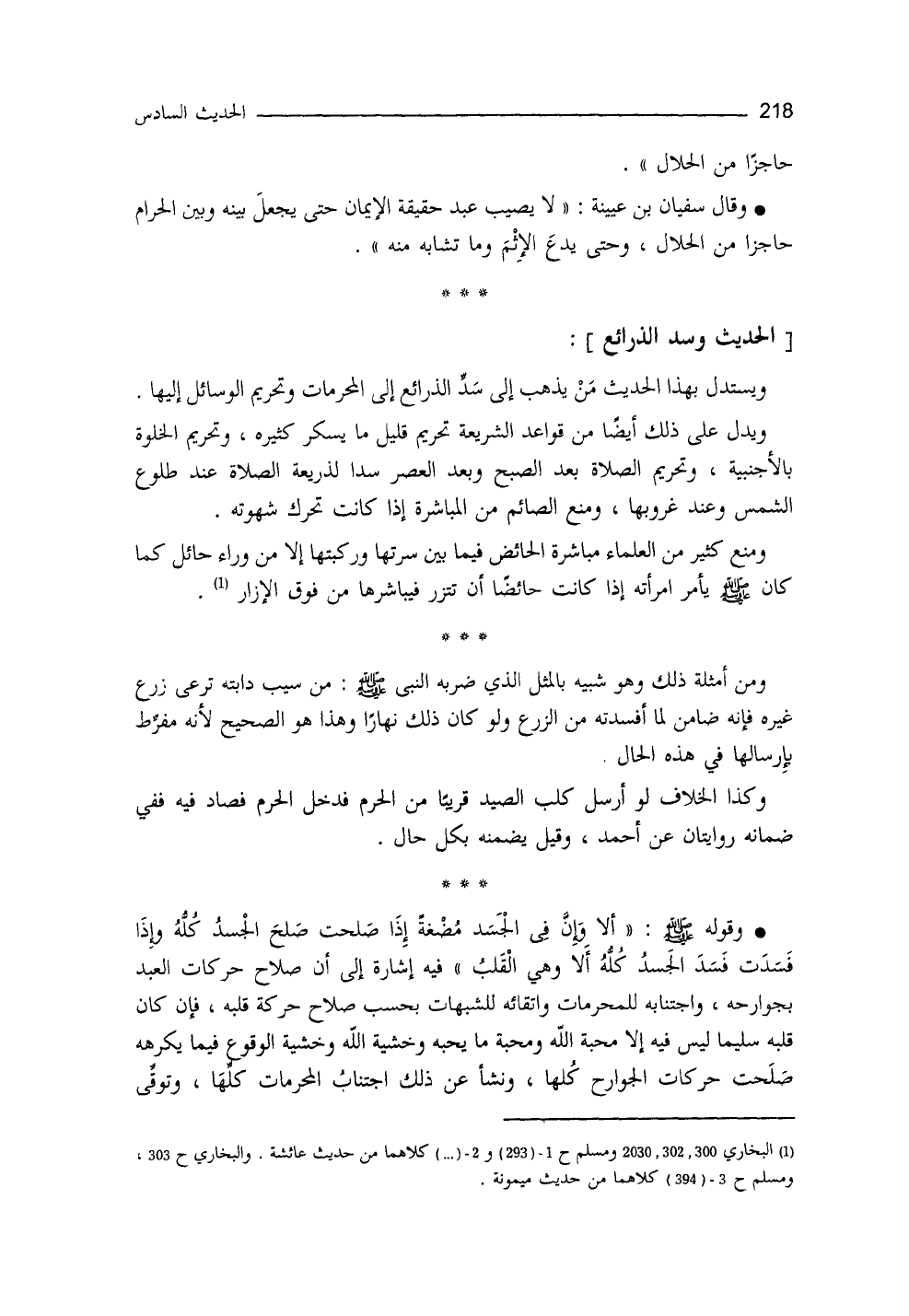 وتحريمُ الخلوة بالأجنبية، وتحريمُ الصَّلاة بعد الصُّبح وبعدَ العصرِ سدَّاً لذريعة الصَّلاة عند طُلوع الشَّمس وعندَ غروبها (¬5) ، ومنعُ الصَّائم من المباشرة إذا كانت تحرِّكُ شهوتَه، ومنع كثيرٍ من العلماءِ مباشرةَ الحائضِ فيما بين سرّتها ورُكبتها إلا مِنْ وراء حائلٍ، كما كان النَّبيُّ - صلى الله عليه وسلم - يأمر امرأتَه إذا كانت حائضاً أنْ تَتَّزر، فيباشِرُها مِنْ فوق الإزار (¬6) .