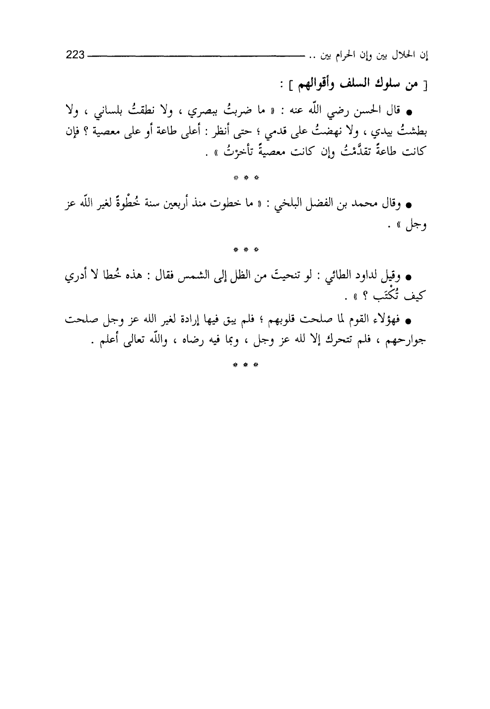وقال محمد بن الفضل البَلخي: ما خطوتُ منذ أربعين سنة خطوةً لغير الله - عز وجل -. وقيل لداود الطائي: لو تنحيتَ من الظلِّ إلى الشمس، فقال: هذه خُطا لا أدري كيف تكتب (¬1) .