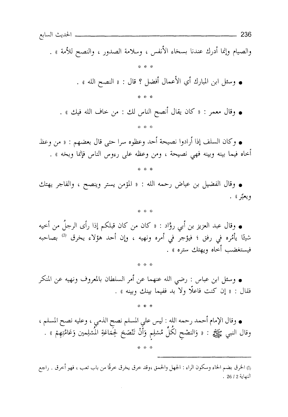 وسئل ابنُ المباركَ: أيُّ الأعمال أفضلُ؟ قال: النصحُ لله.
