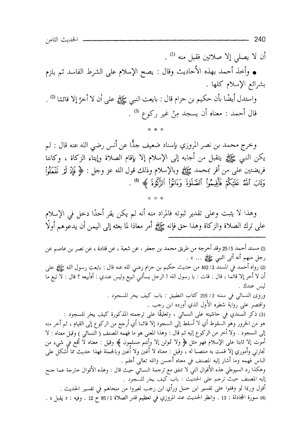 وأخذ الإمام أحمد بهذه الأحاديث، وقال: يصحُّ الإسلامُ على الشرط الفاسد، ثم يُلزم بشرائع الإسلام كُلها، واستدلَّ أيضاً بأنَّ حكيم بنَ حِزام قال: بايعتُ النَّبيَّ - صلى الله عليه وسلم - على أن لا أَخِرَّ إلاّ قائماً (¬2) . قال أحمد: معناه أنْ يسجد من غير ركوع (¬3) .