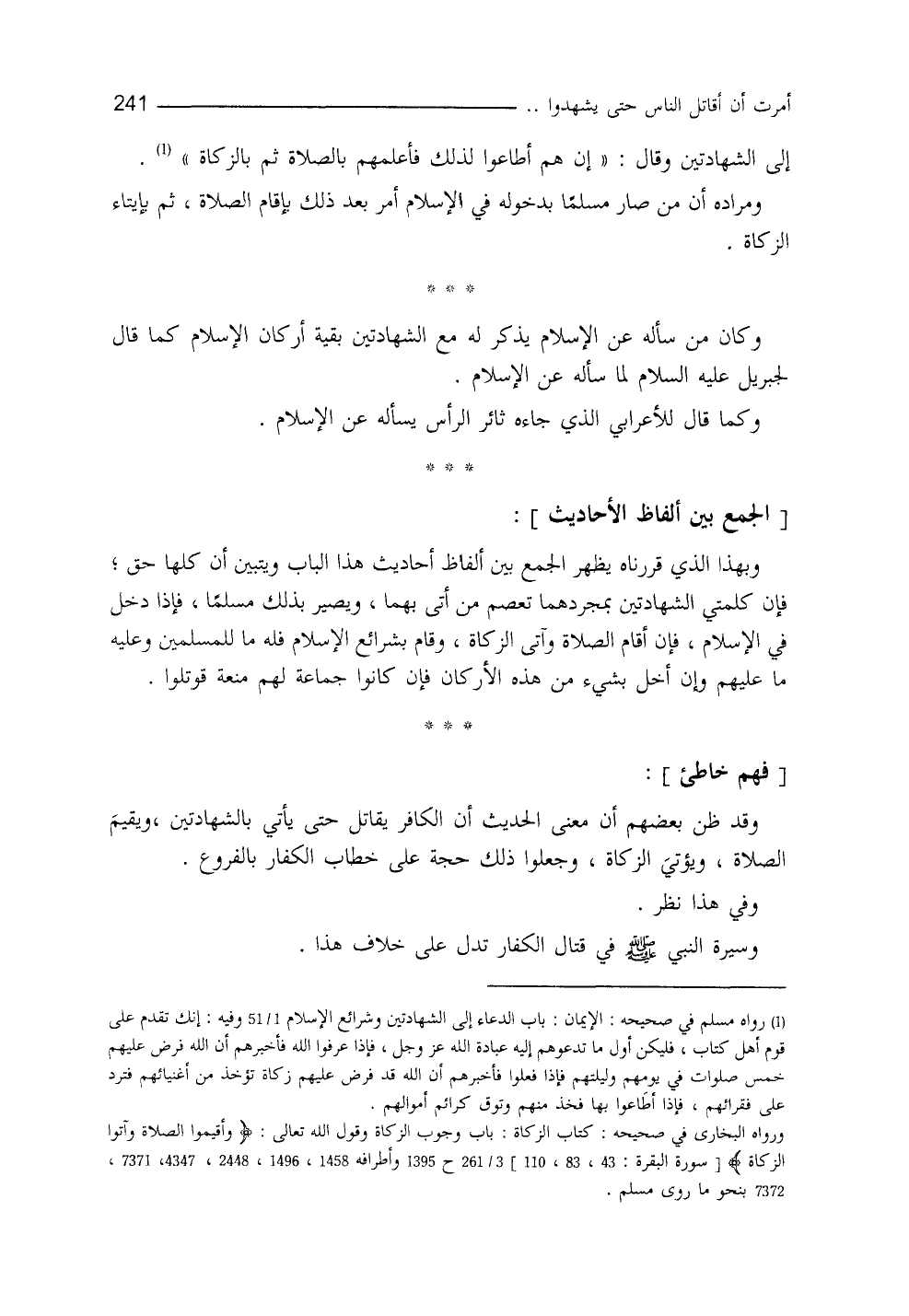 ومرادُه أنَّ من صار مسلماً بدخوله في الإسلام أمر (¬2) بعد ذلك بإقام الصلاة، ثم بإيتاء الزكاة، وكان من سأله عن الإسلام يذكر له مع الشهادتين بقية أركان (¬3) الإسلام، كما قال لجبريل - عليه السلام - لما سأله عن الإسلام (¬4) ، وكما قال للأعرابيِّ الذي جاءه ثائر الرأس يسأل عن الإسلام (¬5) .