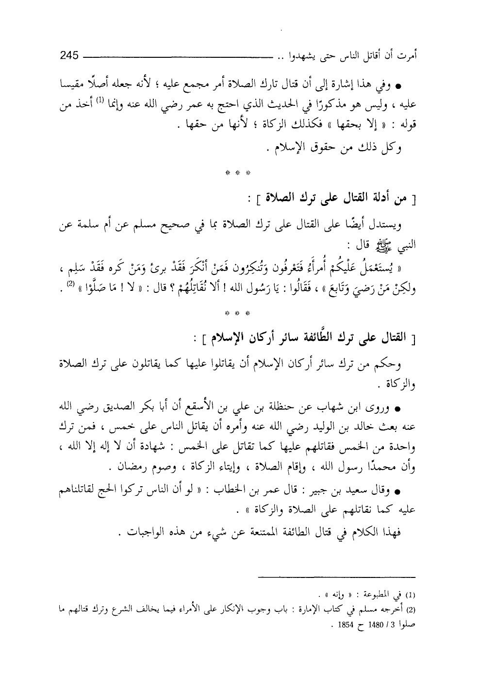 ويُستدلُّ أيضاً على القتال على ترك الصلاة بما في " صحيح مسلم " (¬3)
