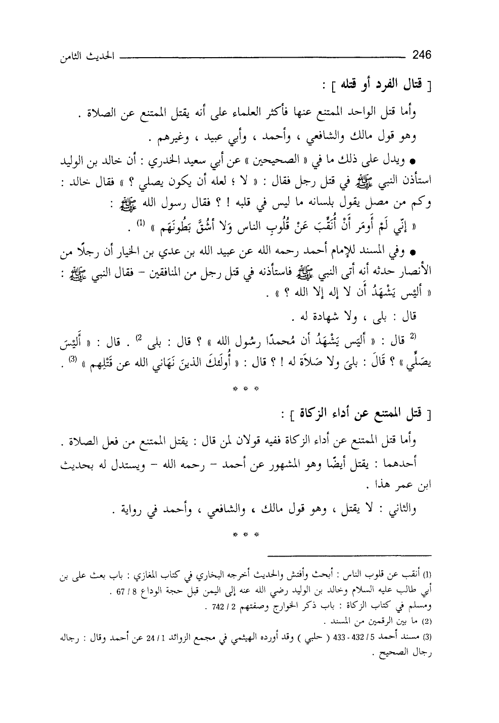 (¬1) قال الإمام ابن رشد القرطبي: ((وأما الواجب على من تركها عمداً وأُمر بها فأبى أنْ يصليها لا جحوداً لفرضها، فإنَّ قوماً ما قالوا: يقتل، وقوماً قالوا: يُعزر ويحبس، والذين قالوا يقتل منهم من أوجب قتله كفراً، وهو مذهب أحمد وإسحاق وابن المبارك وأبو إسحاق بن شاقلا والحسن البصري والنخعي وأيوب السختياني والشعبي والأوزاعي ومحمد بن الحسن وابن حزم وحماد بن زيد وابن حامد، ومنهم من أوجبه حَدَّاً وهو مالك والشافعي وأبو حنيفة وأصحابه. وأهل الظاهر ممن رأى حبسه وتعزيره حتى يُصلي. والسبب في هذا الاختلاف اختلاف الآثار)) .