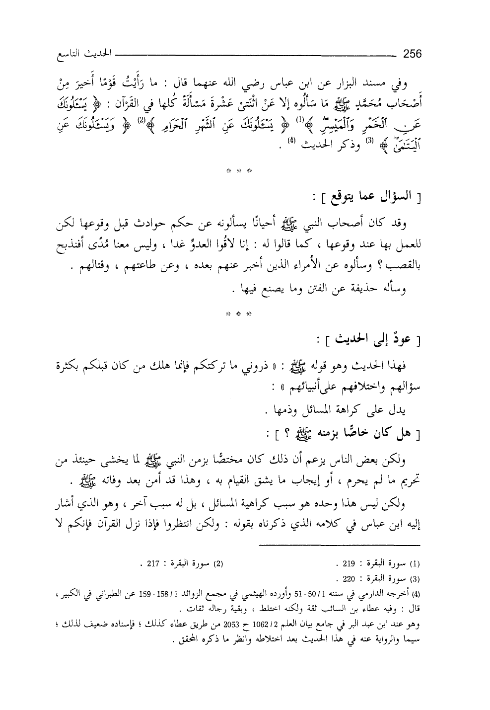 عن ابن عباس قال: ما رأيت قوماً خيراً من أصحابِ محمَّدٍ - صلى الله عليه وسلم - ما سألوه إلا عن اثنتي عشرة مسألةً، كلُّها في القرآن: {يَسْأَلونَكَ عَنِ الْخَمْرِ وَالْمَيْسِرِ} (¬2) ، {يَسْأَلونَكَ عَنِ الشَّهْرِ الْحَرَامِ} (¬3) ، {وَيَسْأَلونَكَ عَنِ