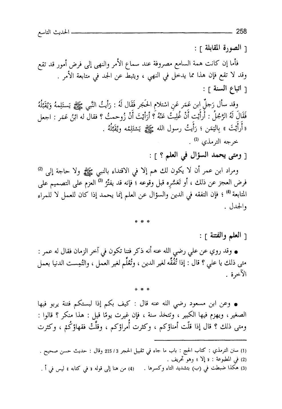 تقع، وقد لا تقع، فإنَّ هذا مما يدخل في النَّهي، ويثبِّطُ عنِ الجد في متابعة الأمر. وقد سألَ رجلٌ ابنَ عمر عن استلام الحجر، فقال له: رأيتُ النَّبيَّ - صلى الله عليه وسلم - يستلمه ويقبِّلُه، فقال له الرجل: أرأيتَ إنْ غُلِبْتُ عليه؟ أرأيت إنْ زُوحِمْتُ؟ فقالَ لهُ ابن عمر: اجعل ((أرأيت)) باليمن، رأيتُ النَّبيَّ - صلى الله عليه وسلم - يستلِمُه ويقبِّلُه. خرَّجه الترمذي (¬1) .