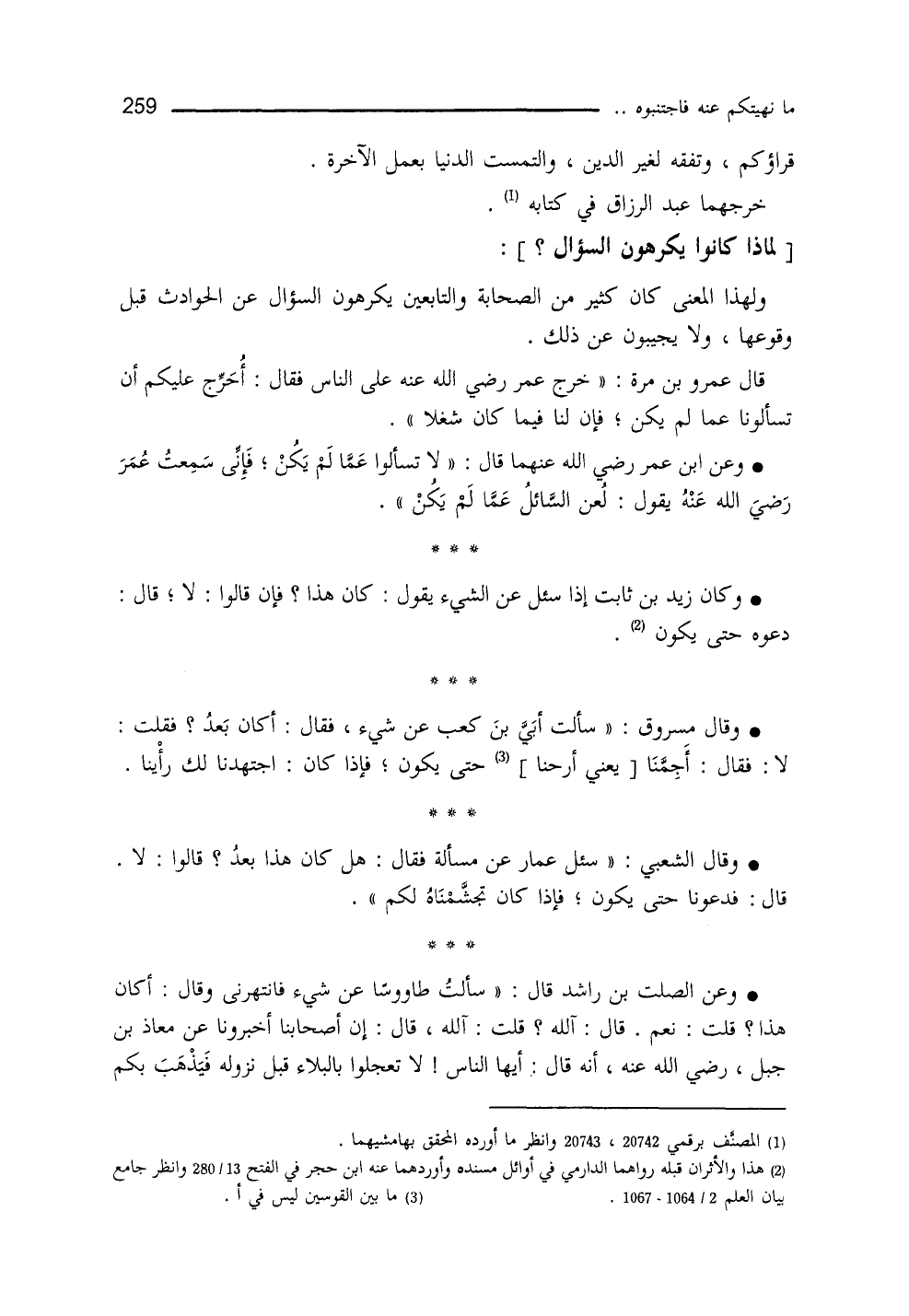 ولهذا المعنى كان كثيرٌ من الصحابة والتابعين يكرهون السؤال عن الحوادث قبلَ وقوعها، ولا يُجيبون عن ذلك، قال عمرو بن مُرة: خرج عمرُ على الناس، فقال: أُحرِّجُ عليكم أنْ تسألونا عن ما لم يكن، فإنَّ لنا فيما كان شغلاً (¬2) .