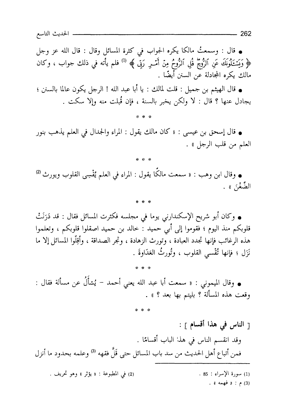 وقال: سمعتُ مالكاً يكره (¬1) الجوابَ في كثرة المسائل (¬2) ، وقال: قال الله - عز وجل -: {وَيَسْأَلونَكَ عَنِ الرُّوحِ قُلِ الرُّوحُ مِنْ أَمْرِ رَبِّي} (¬3) فلم يأته في ذلك جواب.