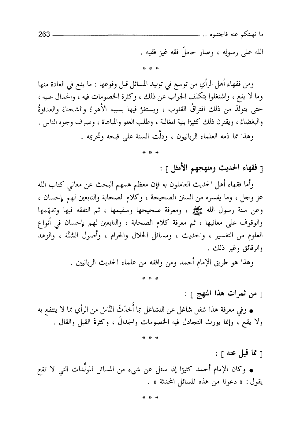 وأما فقهاء أهل الحديث العامِلُون به، فإنَّ معظمَ همِّهمُ البحثُ عن معاني كتاب الله - عز وجل -، وما يُفسِّرُهُ من السنن الصحيحة، وكلام الصحابة والتابعين لهم بإحسّان، وعن سُنَّةِ رسول الله - صلى الله عليه وسلم -، ومعرفة صحيحها وسقيمِها، ثم التفقه فيها وتفهمها، والوقوف على معانيها، ثم معرفة كلام الصحابة والتابعين لهم بإحسّان في أنواع العلوم من التفسير والحديث، ومسائل الحلال والحرام، وأصول السُّنة والزهد والرقائق وغيرِ ذلك، وهذا هو طريقة الإمام أحمد ومَنْ وافقه من علماء الحديث الرَّبّانيين، وفي معرفة هذا شغلٌ شاغلٌ عن التَّشاغُل بما أحدثَ من الرأي ممَّا لا يُنتفع به، ولا يقع، وإنَّما يُورثُ التجادلُ فيه الخصوماتِ والجدالَ وكثرة القيل والقال. وكان الإمام أحمد كثيراً إذا سُئِلَ عن شيء من المسائل المولدات التي لا تقع يقول: دعونا منْ هذه المسائل المحدثة (¬3) .