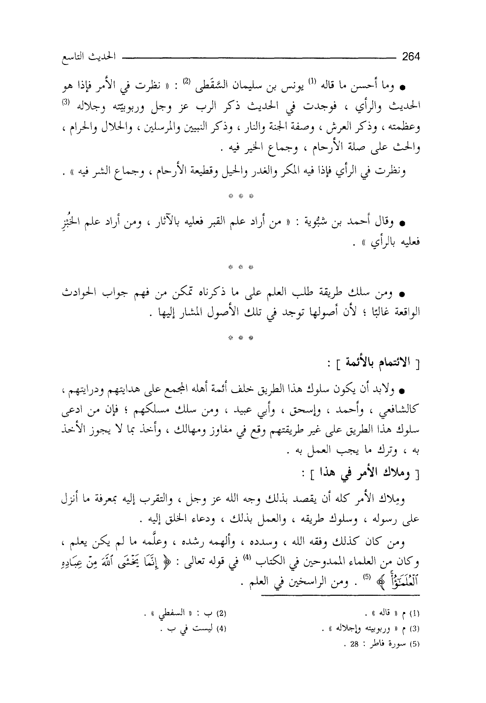 ومِلاكُ الأمرِ كلِّه أنْ يقصِدَ بذلك وجه الله، والتقرُّبَ إليه بمعرفة ما أنزل على رسوله، وسلوكِ طَريقه، والعمل بذلك، ودعاء الخلق إليه، ومَنْ كان كذلك، وفَّقه الله وسدَّده، وألهمه رشده، وعلَّمه ما لم يكن يعلم، وكان من العلماء الممدوحين في الكتاب في قوله تعالى: {إِنَّمَا يَخْشَى اللهَ مِنْ عِبَادِهِ الْعُلَمَاء} (¬4) ، ومن الراسخين في العلم،