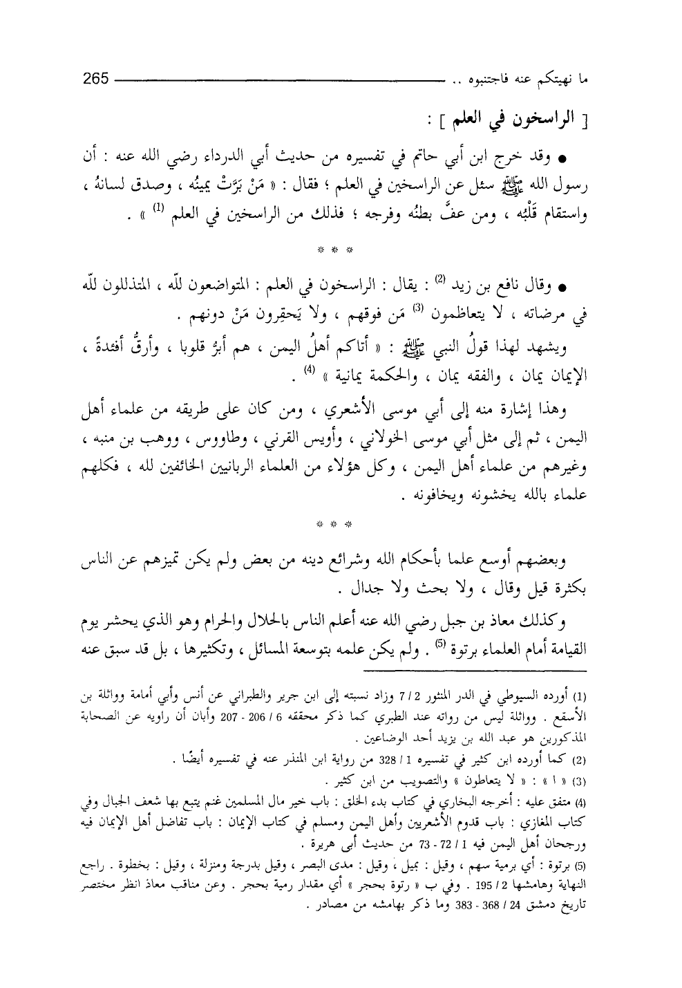 وقد خرَّج ابنُ أبي حاتم في "تفسيره" من حديث أبي الدرداء: أنَّ رسول الله - صلى الله عليه وسلم - سُئِل عن الرَّاسخين في العلم، فقال: ((من برَّت يمينُه، وصدق لسانُه، واستقامَ قلبُه، ومن عفَّ بطنُه وفرجُه، فذلك مِنَ الرَّاسخين في العلم)) (¬1) .