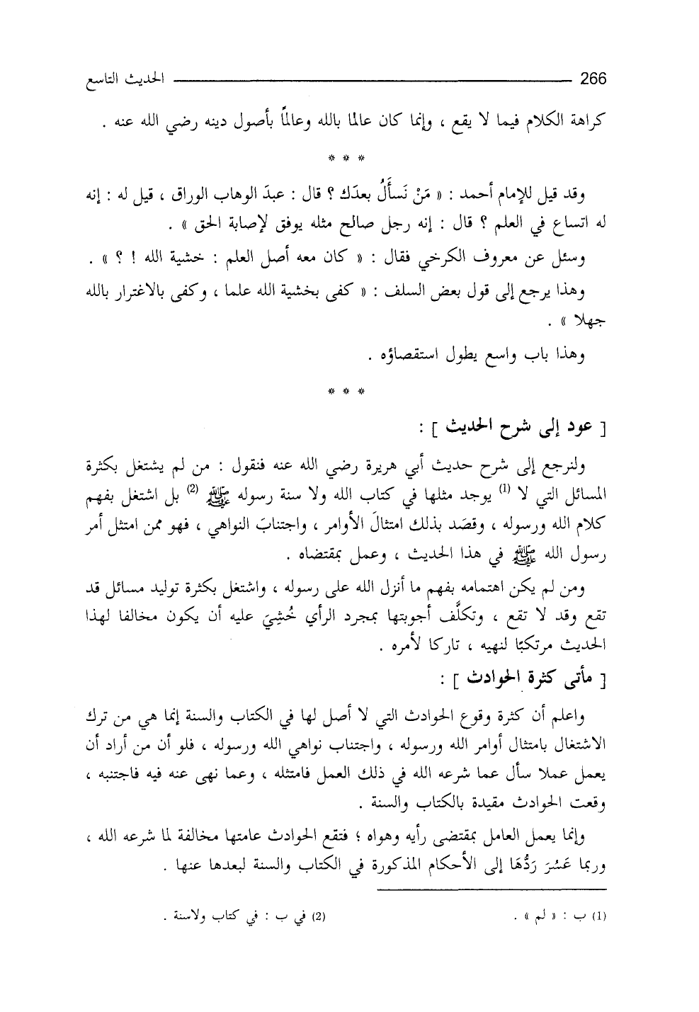 ولنرجع إلى شرح حديث أبي هريرة - رضي الله عنه - فنقول: مَنْ لم يشتغل بكثرة المسائل التي لا يوجدُ مثلُها في كتاب، ولا سنة، بل اشتغل بفهم كلام الله ورسوله، وقصدُه بذلك امتثالُ الأوامر، واجتنابُ النواهي، فهو ممَّنِ امتثلَ أمرَ رسول الله - صلى الله عليه وسلم - في هذا الحديث، وعَمِلَ بمقتضاه، ومن لم يكن اهتمامُه بفهم ما أنزل الله على رسوله، واشتغل بكثرةِ توليدِ المسائل قد تقع وقد لا تقع، وتكلَّفَ أجوبتها بمجرَّد الرأي، خُشِيَ عليه أنْ يكونَ مخالفاً لهذا الحديث، مرتكباً لنهيه، تاركاً لأمره.