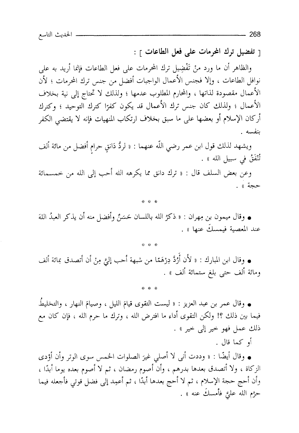 والظاهر أنَّ ما ورد مِن تفضيل ترك المحرَّمات على فعل الطاعات، إنَّما أُريد به على نوافل الطّاعات، وإلاّ فجنسُ الأعمال الواجبات أفضلُ مِنْ جنسِ ترك المحرَّمات؛ لأنَّ الأعمال مقصودة لذاتها، والمحارم المطلوبُ عدمها، ولذلك لا تحتاج إلى نية بخلاف الأعمالِ، وكذلك كان جنسُ ترك الأعمال قد يكون كفراً كتركِ التوحيد، وكتركِ أركان الإسلام أو بعضها على ما سبق، بخلاف ارتكاب (¬1) المنهيات فإنَّه لا يقتضي الكفر بنفسه، ويشهد لذلك قولُ ابنِ عمر: لردُّ دانقٍ من حرام أفضلُ مِنْ مئة ألف تُنْفَقُ في سبيل الله.