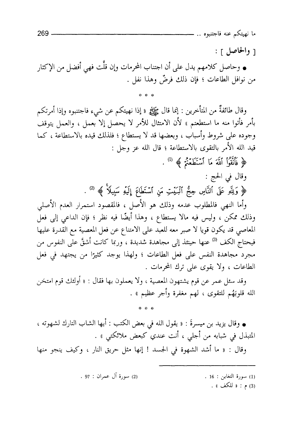 وحاصل كلامهم يدلُّ على أنَّ اجتناب المحرمات - وإنْ قلَّتْ - فهي أفضلُ من الإكثار من نوافل الطاعات فإنَّ ذلك فرضٌ، وهذا نفلٌ.