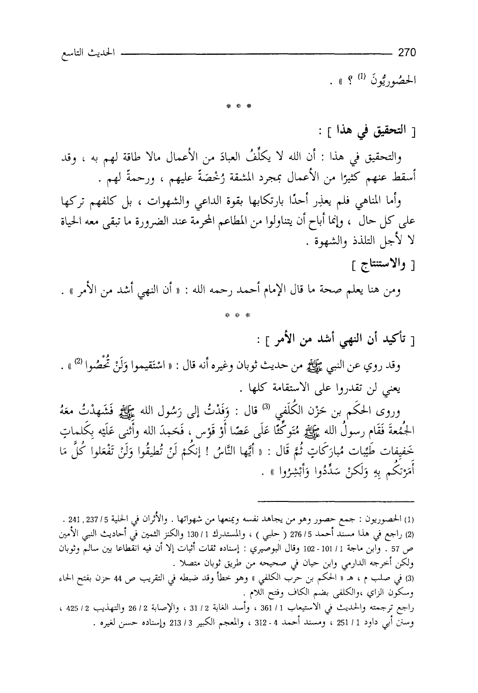 تركها على كلِّ حال، وأنَّ ما أباح أنْ يُتناول مِنَ المطاعم المحرَّمة عند الضرورة ما تبقى معه الحياة، لا لأجل التلذذ والشهوة، ومن هنا يعلم صحة ما قاله الإمام أحمد: إنَّ النهي أشدُّ من الأمر. وقد روي عن النَّبيِّ - صلى الله عليه وسلم - من حديث ثوبان وغيره أنَّه قال: ((استقيموا ولن تُحْصُوا)) (¬2) يعني: لن تقدروا على الاستقامة كلها.