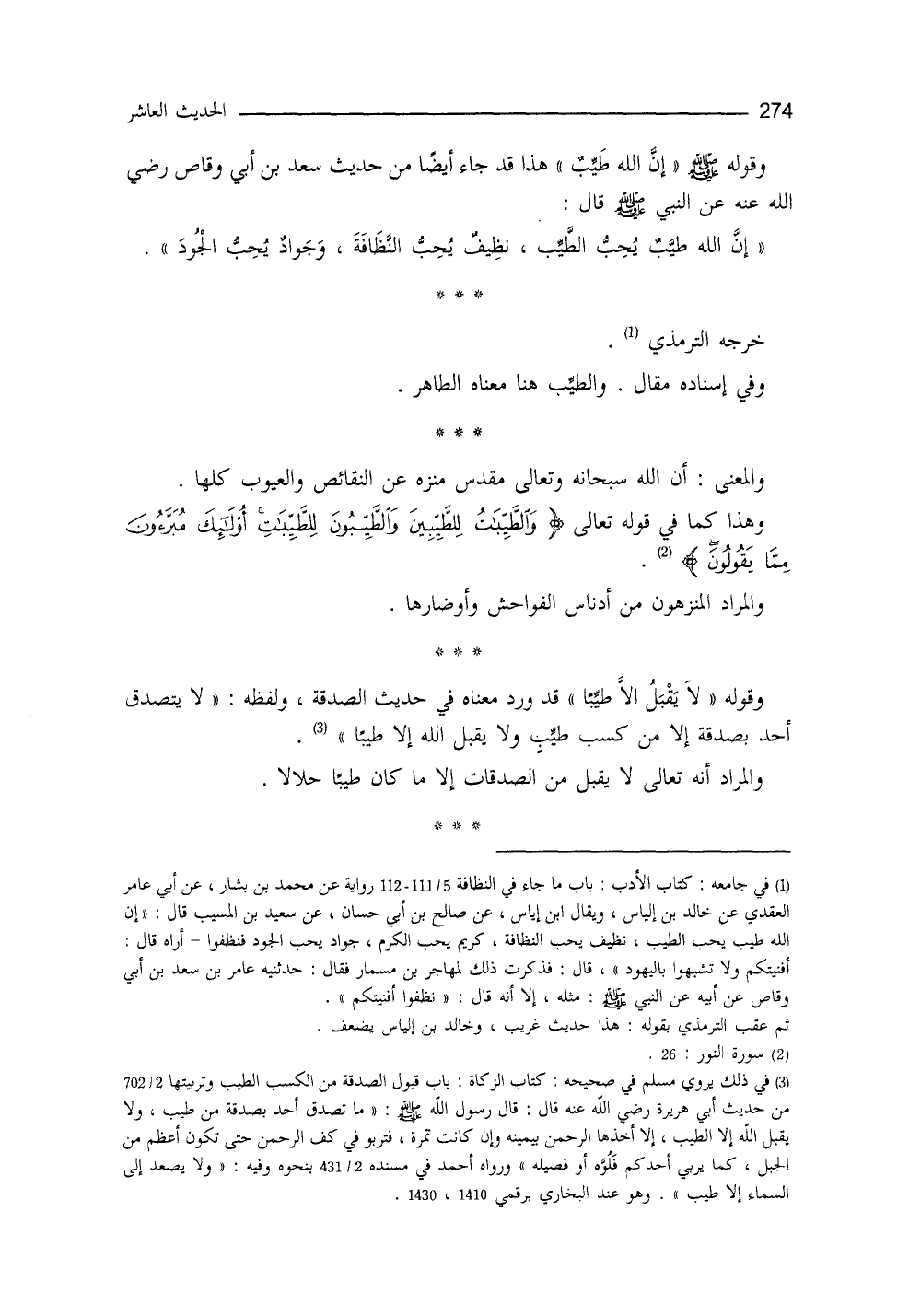 وقوله - صلى الله عليه وسلم -: ((إنَّ الله تعالى طيب)) هذا قد جاء أيضاً من حديث سعد بن أبي وقاص، عنِ النَّبيِّ - صلى الله عليه وسلم -، قال: ((إن الله طيِّبٌ يحبُّ الطَّيِّبَ، نظيفٌ يحبُّ النظافة، جواد يحبُّ الجود)) . خرَّجه الترمذي (¬1) ،