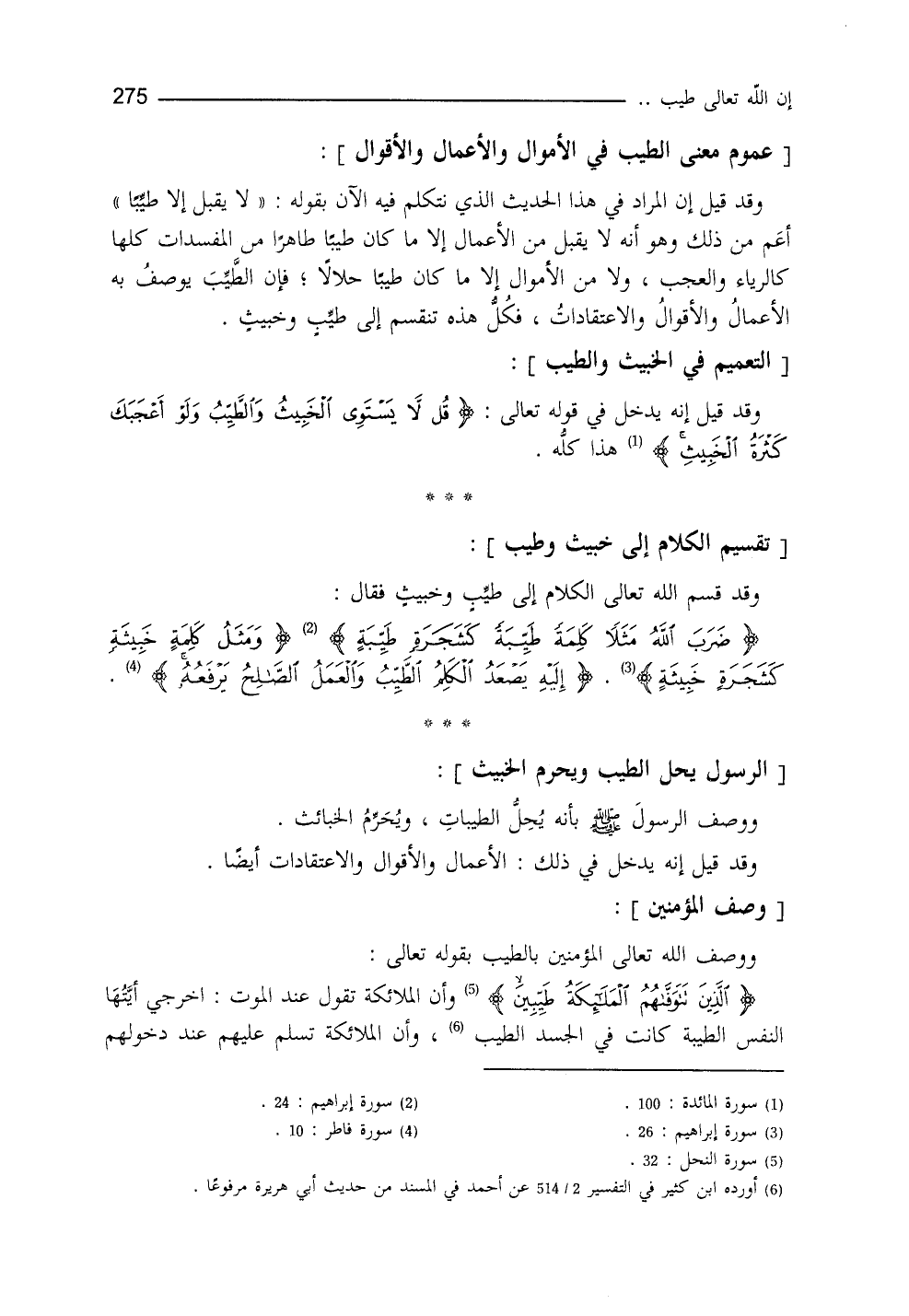 وقد قسَّم الله تعالى الكلام إلى طيب وخبيث، فقال: {ضَرَبَ اللهُ مَثَلاً كَلِمَةً طَيِّبَةً كَشَجَرَةٍ طَيِّبَة} (¬3) ، {وَمَثَلُ كَلِمَةٍ خَبِيثَةٍ كَشَجَرَةٍ خَبِيثَةٍ} (¬4) ، وقال تعالى: {إِلَيْهِ يَصْعَدُ الْكَلِمُ الطَّيِّبُ} (¬5) ، ووصف الرسول - صلى الله عليه وسلم - بأنَّه يحلُّ الطيبات ويحرِّمُ الخبائث.