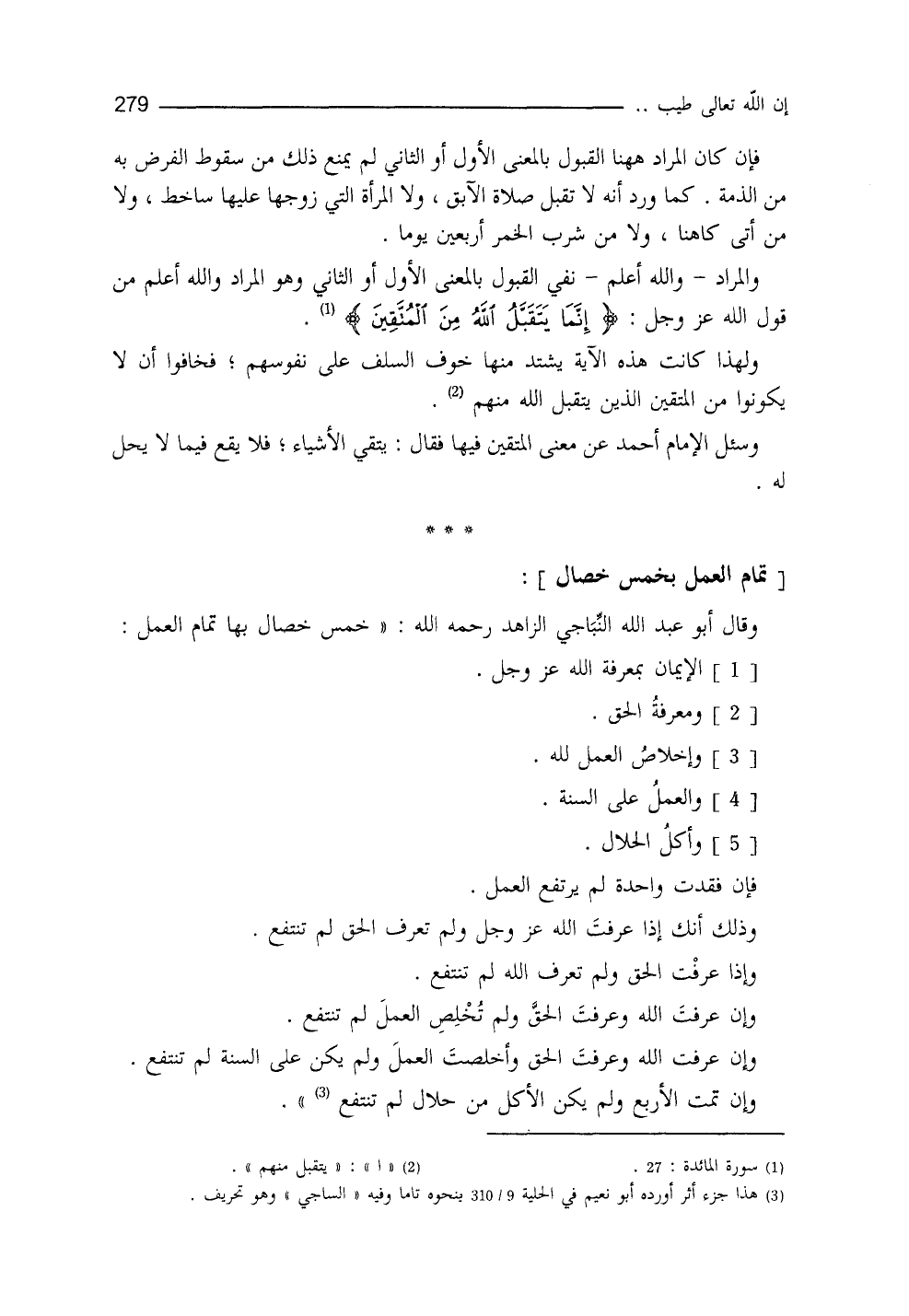 فإنْ كان المراد هاهنا القبولَ بالمعنى الأوَّل أو الثاني لم يمنع ذلك من سقوط الفرض به من الذمة (¬1) ، كما ورد أنَّه لا تقبل صلاة الآبق، ولا المرأة التي زوجها عليها ساخطٌ، ولا من أتى كاهناً، ولا من شرب الخمر أربعين يوماً، والمراد - والله أعلم - نفي القبول بالمعنى الأوَّل أو الثاني، وهو المراد - والله أعلم - من قوله - عز وجل -: {إنَّما يَتقبَّلُ الله من المتَّقين} (¬2) . ولهذا كانت هذه الآية يشتدُّ منها خوفُ السَّلف على نفوسهم، فخافوا أنْ لا يكونوا من المتَّقين الذين يُتقبل منهم.