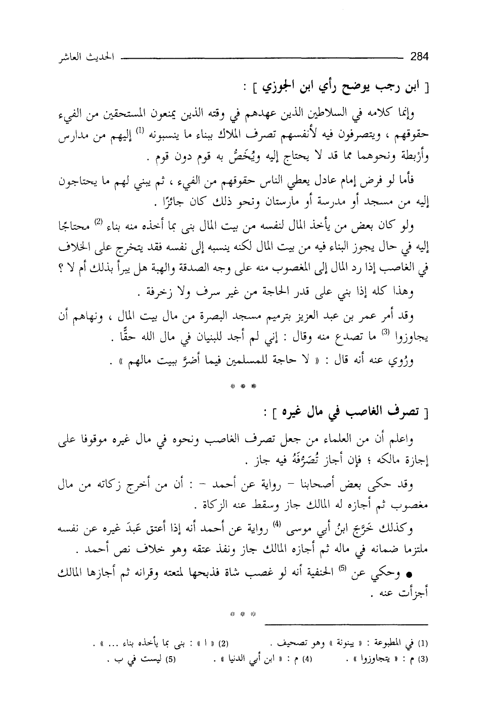 وإنَّما كلامُه في السلاطين الذين عهدهم في وقته الذين يمنعون المستحقين من الفيء حقوقهم، ويتصرَّفونَ فيه لأنفسهم تصرف المُلاَّكِ ببناء ما ينسبونه إليهم من مدارسَ وأربطةٍ ونحوها مما قد لا يحتاج إليه، ويخص به قوماً دون قوم، فأما لو فرض إمامٌ عادلٌ يعطي الناس حقوقهم من الفيء، ثم يبني لهم منه ما يحتاجون إليه من مسجدٍ، أو مدرسة، أو مارستان، ونحوِ ذلك كان ذلك جائزاً، ولو كان بعضُ من يأخذ المال لنفسه من بيت المال بنى بما أخذه بناء محتاجاً إليه في حال، يجوز البناء فيه من بيتِ المال، لكنَّه نسبه إلى نفسه، فقد يتخرَّجُ على الخلاف في الغاصب إذا ردَّ المالَ إلى المغصوب منه على وجه الصدقة والهبة هل يبرأ بذلك أم