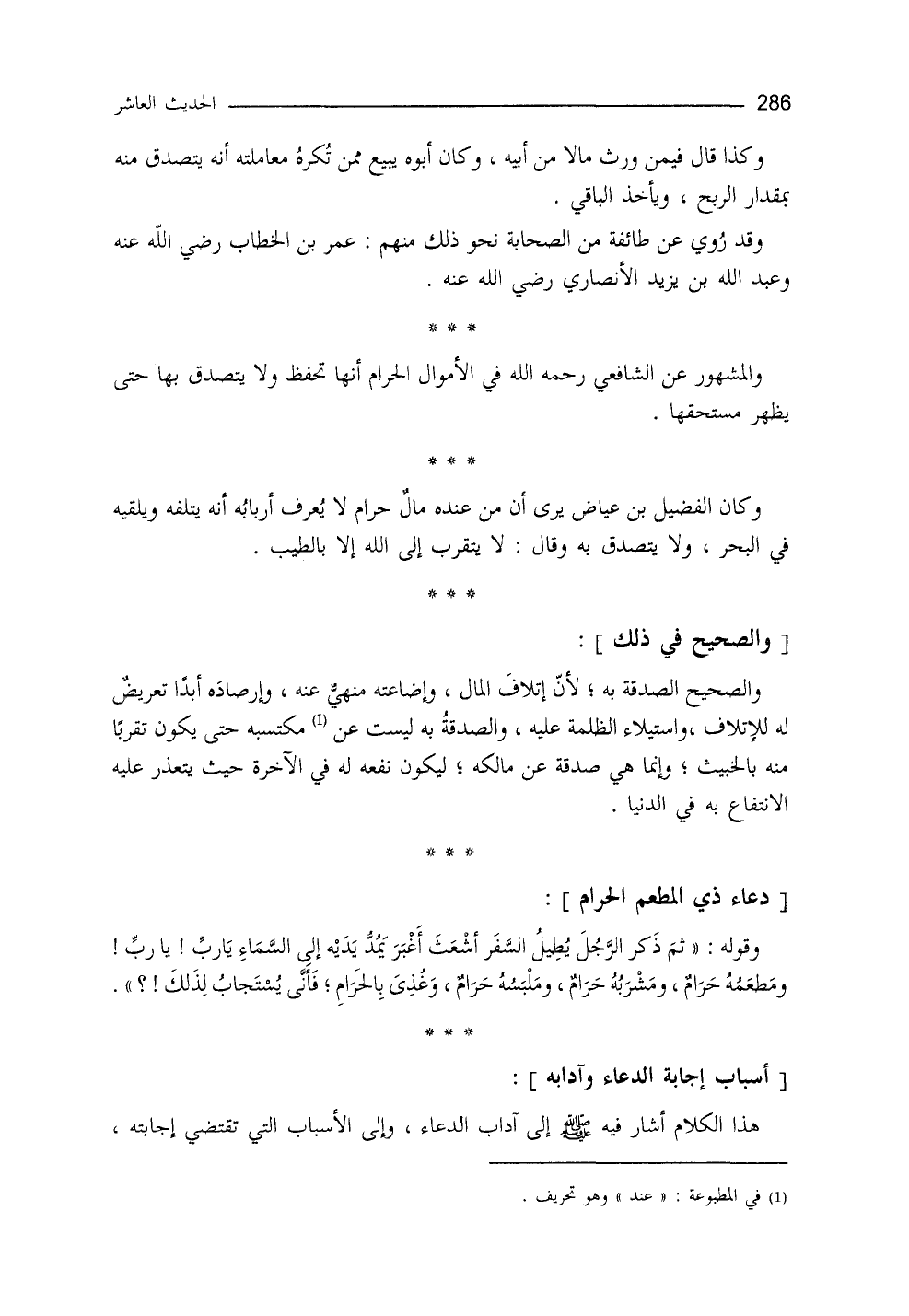 وكان الفضيلُ بنُ عياض يرى: أنَّ من عنده مالٌ حرامٌ لا يعرف أربابه، أنَّه يُتلفه، ويُلقيه في البحر، ولا يتصدَّق به، وقال: لا يتقرَّب إلى الله إلاَّ بالطيب.