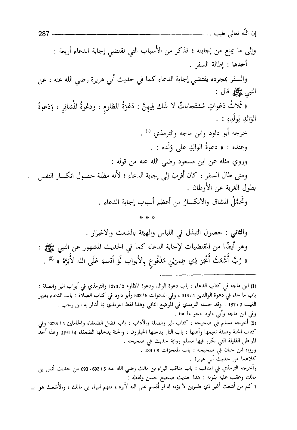 أحدهما: إطالةُ السفر، والسفر بمجرَّده يقتضي إجابةَ الدعاء، كما في حديث أبي هريرة، عن النَّبيِّ - صلى الله عليه وسلم -: ((ثلاثُ دعواتٍ مستجابات لا شك فيهن: دعوةُ المظلومِ، ودعوةُ المسافر، ودعوةُ الوالد لولده)) (¬1) ، خرَّجه أبو داود وابن ماجه والترمذي، وعنده: ((دعوة الوالد على ولده)) .