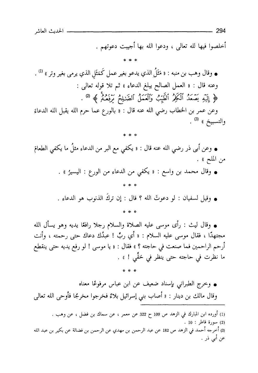 وقال وهب بن مُنبِّه: مَثَلُ الذي يدعو بغير عمل، كمثل الذي يرمي بغير وَتَر (¬1) . وعنه قال: العملُ الصالحُ يبلغ الدعاء، ثم تلا قوله تعالى: {إِلَيْهِ يَصْعَدُ الْكَلِمُ الطَّيِّبُ وَالْعَمَلُ الصَّالِحُ يَرْفَعُه} (¬2) .