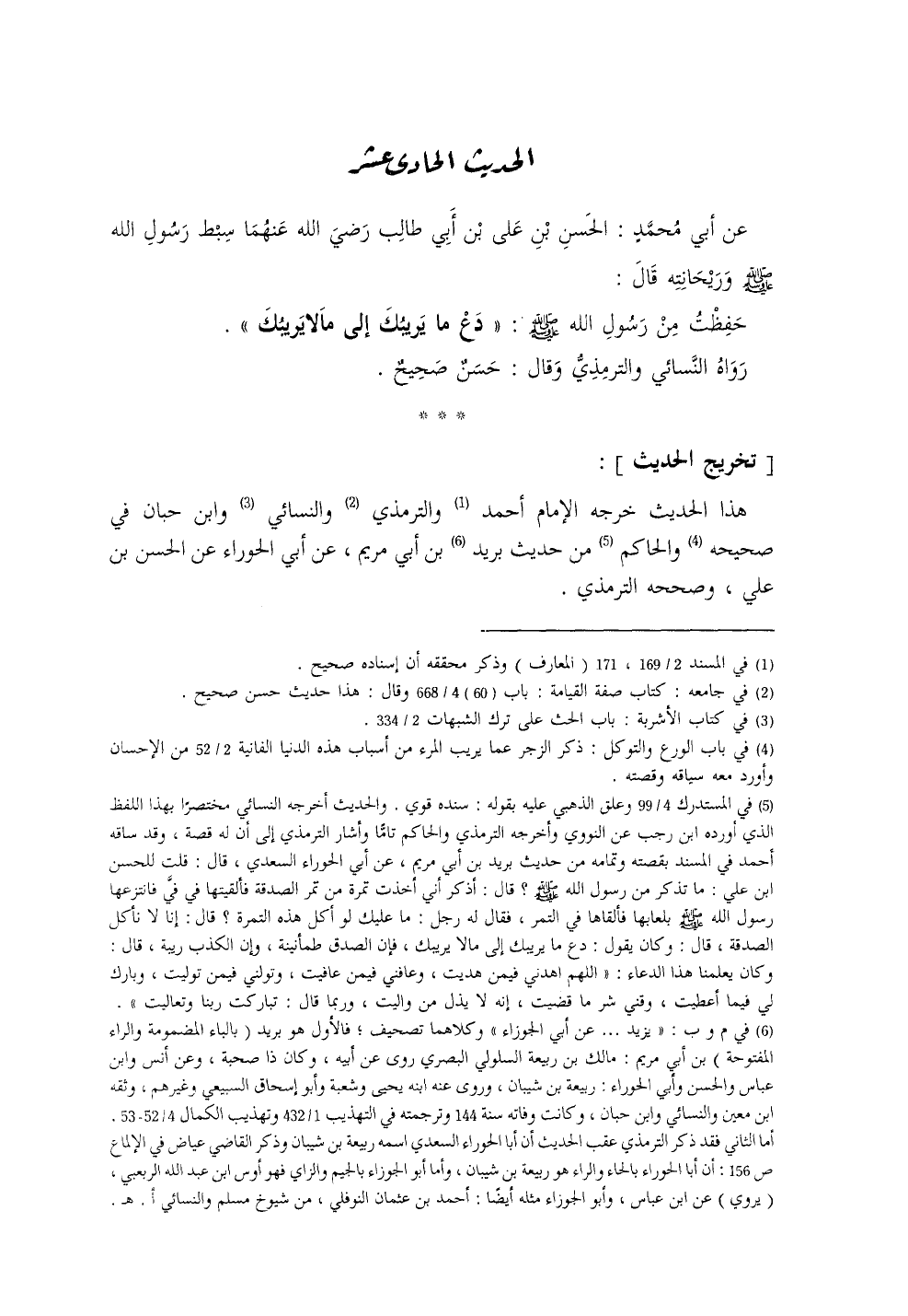 رسولِ الله - صلى الله عليه وسلم -: ((دَعْ ما يريبُكَ إلى ما لاَ يرِيبُكَ)) . رواه النسائي (¬1) والترمِذيُّ (¬2) ، وقال: حَسَنٌ صحيحٌ.