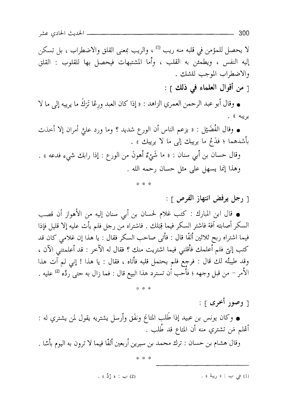 قال ابن المبارك: كتب غلامٌ لحسّانَ بن أبي سنان إليه من الأهواز: إنَّ قَصَبَ السكر أصابته آفةٌ، فاشتر السكر فيما قِبَلَكَ، فاشتراه من رجل، فلم يأتِ عليه إلا قليلٌ فإذا فيما اشتراه ربحَ ثلاثين ألفاً، قال: فأتى صاحبَ السُّكرِ، فقال: يا هذا إنَّ غلامي كان قد كتب إليَّ، فلم أُعْلِمكَ، فأَقِلْني فيما اشتريتُ منك، فقال له الآخر: قد أعلمتني الآن، وقد طَيَّبْتُه لك، قال: فرجع فلم يحتمل قَلْبُهُ، فأتاه، فقال: يا هذا إني لم آتِ هذا الأمر من قبل وجهه، فأُحبُّ أنْ تستردَّ هذا البَيع، قال: فما زال به حتى ردَّ عليه.