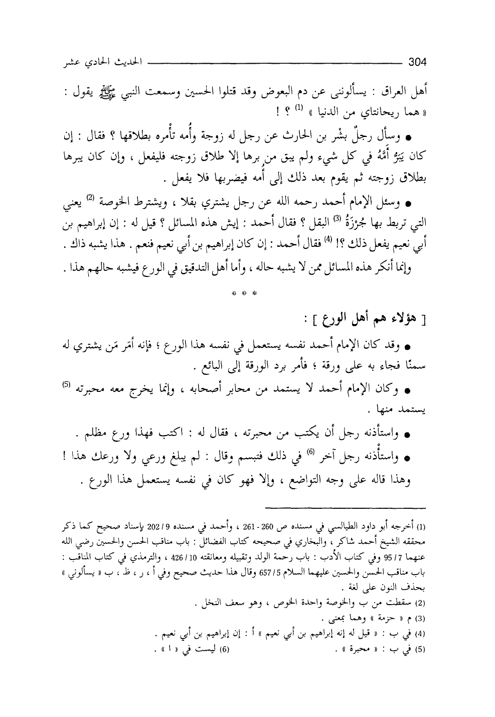 وسئل الإمامُ أحمد رحمه الله عن رجلٍ يشتري بقلاً، ويشترط الخُوصة، يعني: التي تربط بها جُرْزَةُ (¬2) البقل، فقال أحمد: أيش هذه المسائل؟! قيل لهُ: إنَّه إبراهيمَ بن أبي نعيم، فقال أحمد: إنْ كان إبراهيمُ بنُ أبي نعيم، فنعم هذا يُشبه ذاك.