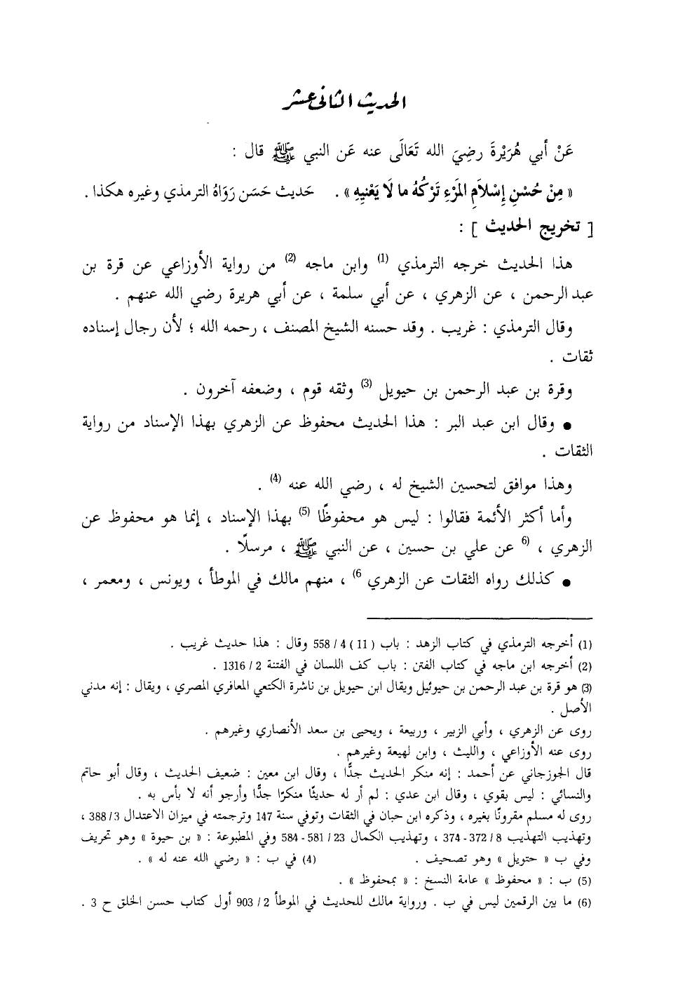 عَنْ أبي هريرةَ - رضي الله عنه -، عن النَّبيِّ - صلى الله عليه وسلم - قال: ((مِنْ حُسْنِ إسْلامِ المَرءِ تَرْكُهُ ما لا يَعْنِيهِ)) حديثٌ حَسَنٌ، رَوَاهُ التِّرمذيُّ وغَيرُهُ.