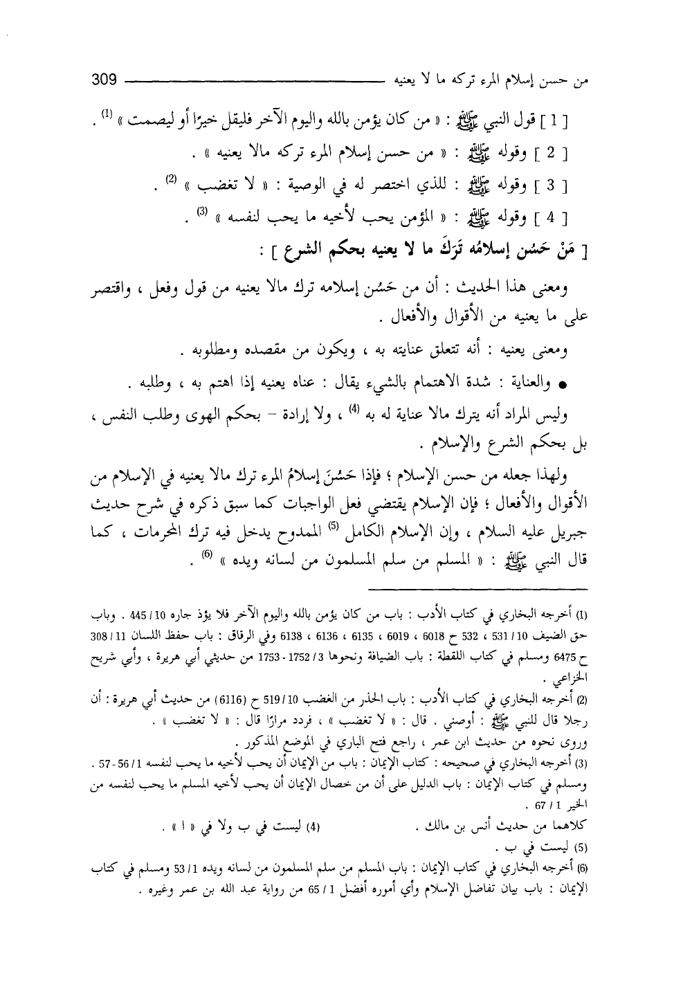 قول النَّبيِّ - صلى الله عليه وسلم -: ((مَنْ كَانَ يُؤمنُ باللهِ واليومِ الآخر فليَقُلْ خيراً أو ليَصْمُتْ)) (¬1) ، وقوله - صلى الله عليه وسلم -: ((مِنْ حُسْنِ إسلامِ المَرءِ تَركُهُ ما لا يَعْنِيهِ)) (¬2) ، وقوله للذي اختصر له في الوصية: ((لا تَغْضَبْ (¬3)) ) ، وقوله - صلى الله عليه وسلم -