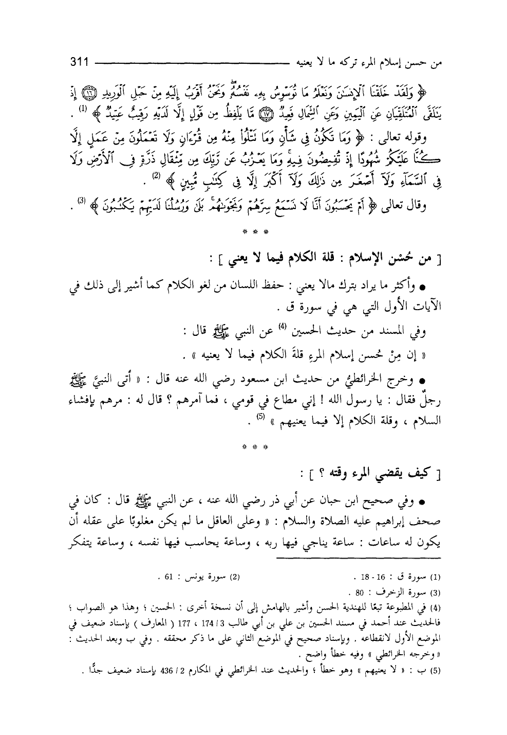 وأكثر ما يُراد بترك ما لا يعني حفظ اللسان من لغو الكلام كما أشير إلى ذلك في الآيات الأولى التي هي في سورة (ق) .
