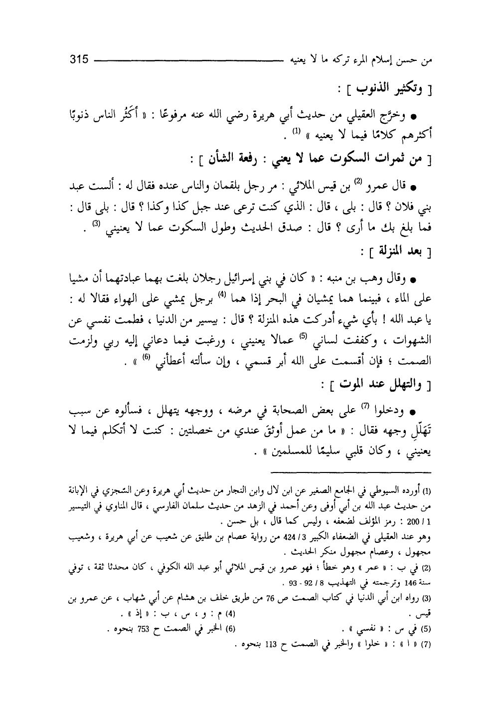 وخرَّج العقيلي من حديث أبي هريرة مرفوعاً: ((أكثرُ الناسِ ذنوباً أكثَرُهُم كلاماً فيما لا يعنيه)) (¬1) .