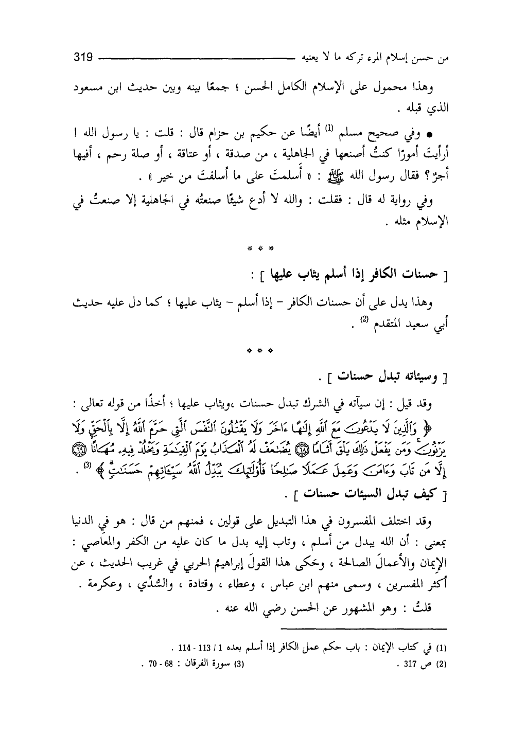 وقد قيل: إنَّ سيئاته في الشرك تبدَّل حسنات، ويُثابُ عليها أخذاً من قوله تعالى: {وَالَّذِينَ لا يَدْعُونَ مَعَ اللهِ إِلَهاً آخَرَ وَلا يَقْتُلُونَ النَّفْسَ الَّتِي حَرَّمَ اللهُ إِلاَّ بِالْحَقِّ وَلا يَزْنُونَ وَمَنْ يَفْعَلْ ذَلِكَ يَلْقَ أَثَاماً يُضَاعَفْ لَهُ الْعَذَابُ يَوْمَ الْقِيَامَةِ وَيَخْلُدْ فِيهِ مُهَاناً إِلاَّ مَنْ تَابَ وَآمَنَ وَعَمِلَ عَمَلاً صَالِحاً فَأُولَئِكَ يُبَدِّلُ اللهُ سَيِّئَاتِهِمْ حَسَنَاتٍ} (¬3) ، وقد اختلف المفسرون في هذا التبديل على قولين: