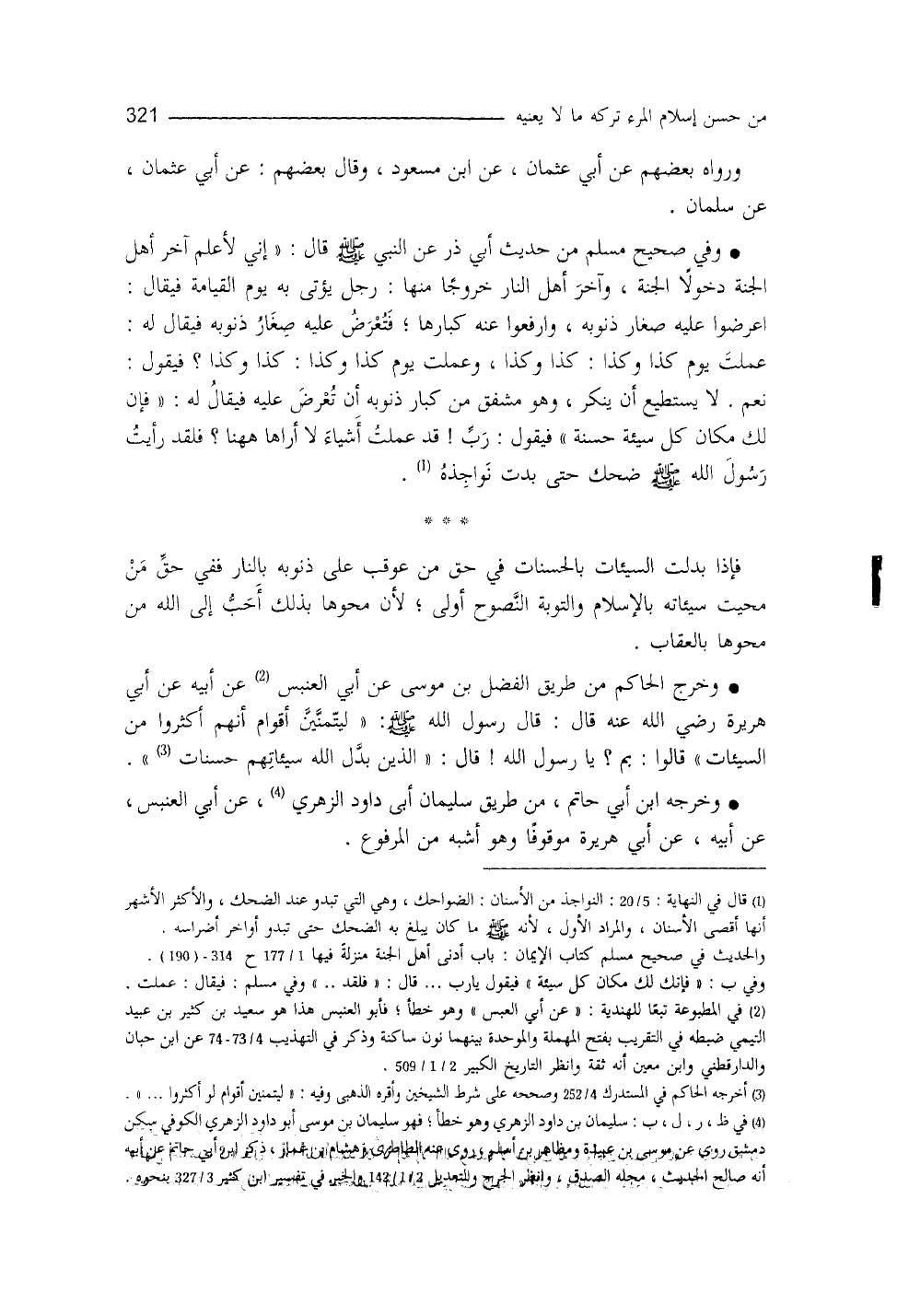 من حديث أبي ذرٍّ، عن النَّبيِّ - صلى الله عليه وسلم - قال: ((إنِّي لأعْلَمُ آخِرَ أهلِ الجنَّةِ دُخولاً الجنَّة، وآخِرَ أهلِ النار خروجاً منها، رجلٌ يُؤتَى به يوم القيامةِ فيقال: اعرضُوا عليه صِغارَ ذنوبه، وارفَعُوا عنه كِبارَهَا، فيعْرِضُ الله عليه صِغَارَ ذنوبهِ (¬3) ، فيقال له: عَمِلْتَ يوم كذا وكذا كذا وكذا، وعَمِلْتَ يوم كذا وكذا كذا وكذا، فيقول: نعم، لا يستطيعُ أنْ يُنكر وهو مشفقٌ من كبار ذنوبه أنْ تعرض عليهِ، فيقال له: فإنَّ لك مكانَ كُلِّ سيئةٍ حسنةً، فيقول: يا ربِّ قد عمِلْتُ أشياء لا أراها هاهنا)) قال: فلقد رأيتُ رسولَ الله - صلى الله عليه وسلم - ضَحِكَ حتَّى بدتْ نواجذه.