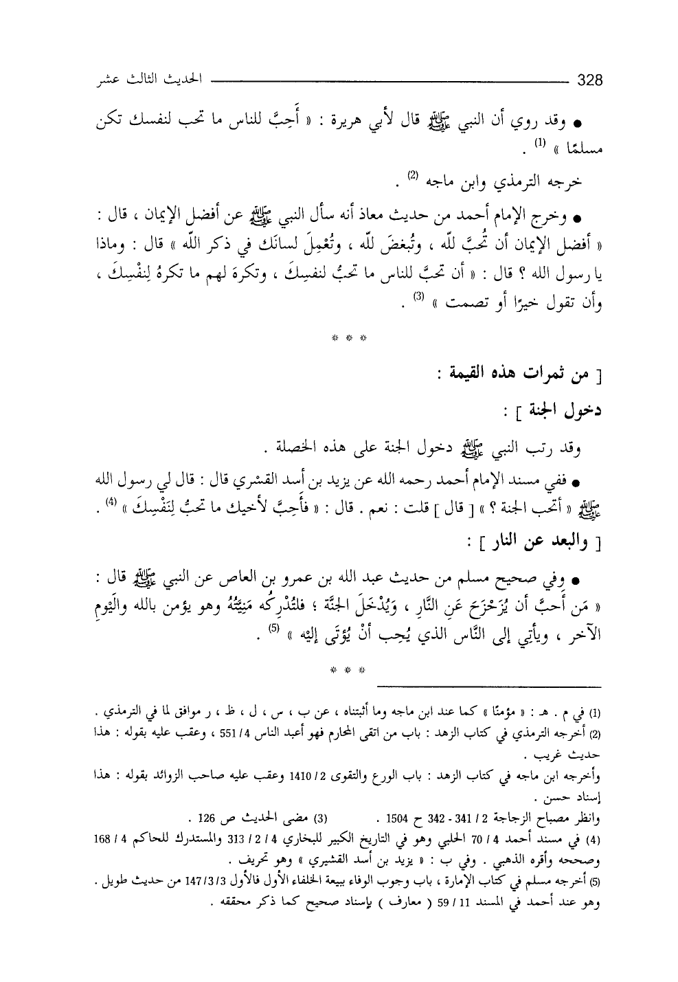 أحمد " (¬3) - رحمه الله - عن يزيد بن أسدٍ القَسْري، قال: قال لي رسول الله - صلى الله عليه وسلم -: ((أتحبُّ الجنَّةَ)) قلت: نعم، قال: ((فأحبَّ لأخيكَ ما تُحبُّ لنفسك)) .