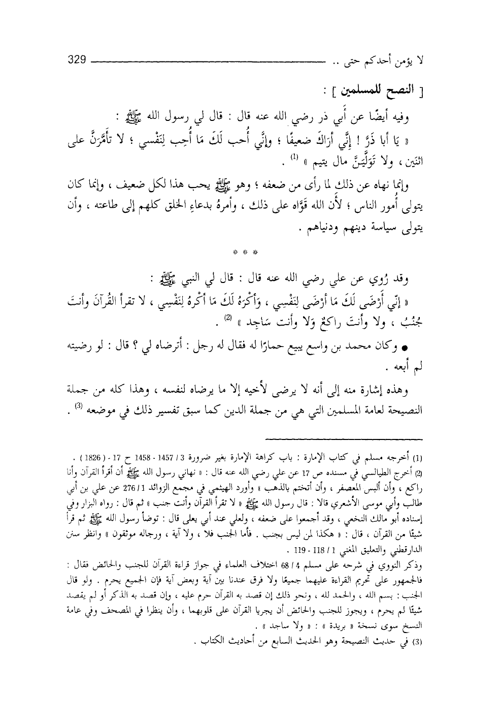 وقد رُوِيَ عن عليٍّ قال: قال لي النَّبيُّ - صلى الله عليه وسلم -: ((إنِّي أرضى لك ما أرضى لِنفسي، وأكره لك ما أكرهُ لنفسي، لا تقرأ القرآن وأنتَ جنبٌ، ولا وأنتَ