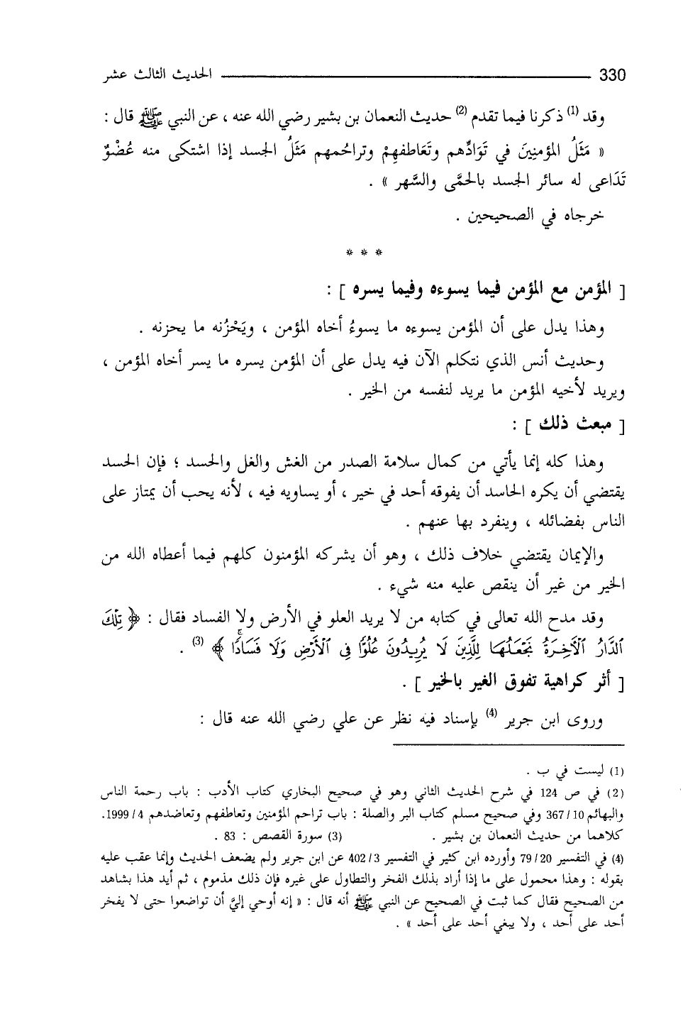 وقد ذكرنا فيما تقدَّم حديثَ النعمان بنِ بشير، عن النَّبيِّ - صلى الله عليه وسلم -، قال: ((مَثَلُ المؤمنينَ في توادِّهم وتعاطفهم وتراحمهم مثلُ الجسدِ، إذا اشتكى منه عُضوٌ، تداعى له سائرُ الجسدِ بالحُمى والسَّهر)) خرَّجاه في " الصحيحين " (¬1) ، وهذا يدلُّ على أنَّ المؤمنَ يسوؤه ما يسوءُ أخاه المؤمن، ويُحزِنُه ما يُحزنه.