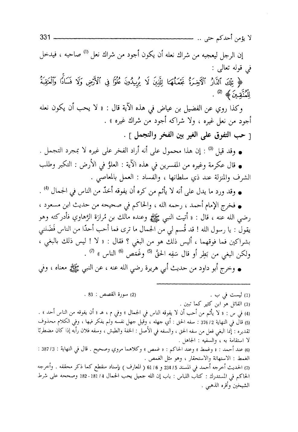 وقد ورد ما يَدُلُّ على أنَّه لا يأثم مَنْ كره أنْ يفوقَه من الناسِ أحدٌ في الجمال، فخرَّج الإمامُ أحمدُ - رحمه الله - (¬7) والحاكم في " صحيحه " (¬8) من حديث ابن مسعود - رضي الله عنه -، قال: أتيتُ النَّبيَّ - صلى الله عليه وسلم - وعنده مالكُ بن مرارةَ الرَّهَاوِيُّ، فأدركتُه وهو يقول: يَا رسولَ الله، قد قُسِمَ لي من الجمال ما ترى، فما أحبُّ أحداً من النَّاس فضلني بشِراكَيْن فما فوقهما، أليس ذلك هو من البَغي؟ فقال: ((لا، ليس ذلك بالبغي، ولكن البغي من بَطِرَ - أو قال: سفه - الحقَّ وغَمط الناس)) .