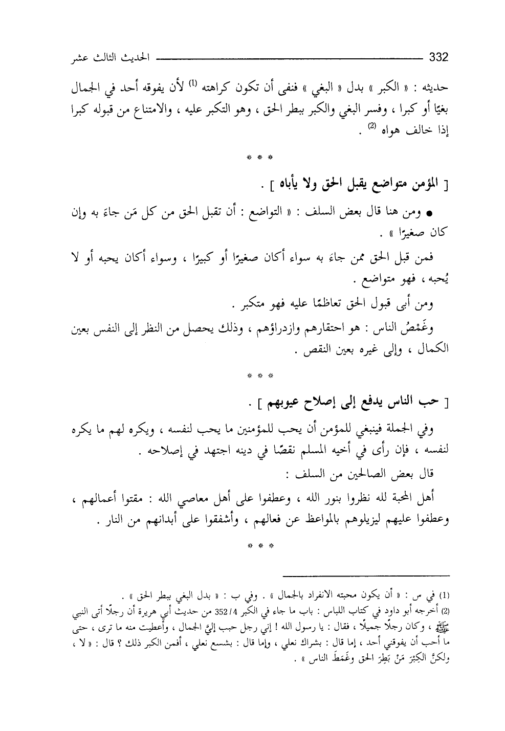 فنفى أنْ تكونَ كراهتُه؛ لأنْ يَفوقَهُ أحدٌ في الجمال بغياً أو كبراً، وفسَّر الكبر والبغي ببطر الحقِّ وغمط الناس (¬2) ، وهو التكبُّر عليه، والامتناع مِن قبوله كِبراً إذا خالف هواه. ومن هنا قال بعض السَّلف: التَّواضُعُ أنْ تَقْبَلَ الحقَّ مِن كلِّ من جاء به، وإنْ كان صغيراً، فمن قَبِلَ الحقَّ ممَّن جاء به، سواء كان صغيراً أو كبيراً، وسواء كان يحبُّه أو لا يحبه، فهو متواضع، ومن أبى قَبُولَ الحقِّ تعاظُماً عليه، فهو متكبِّرٌ.