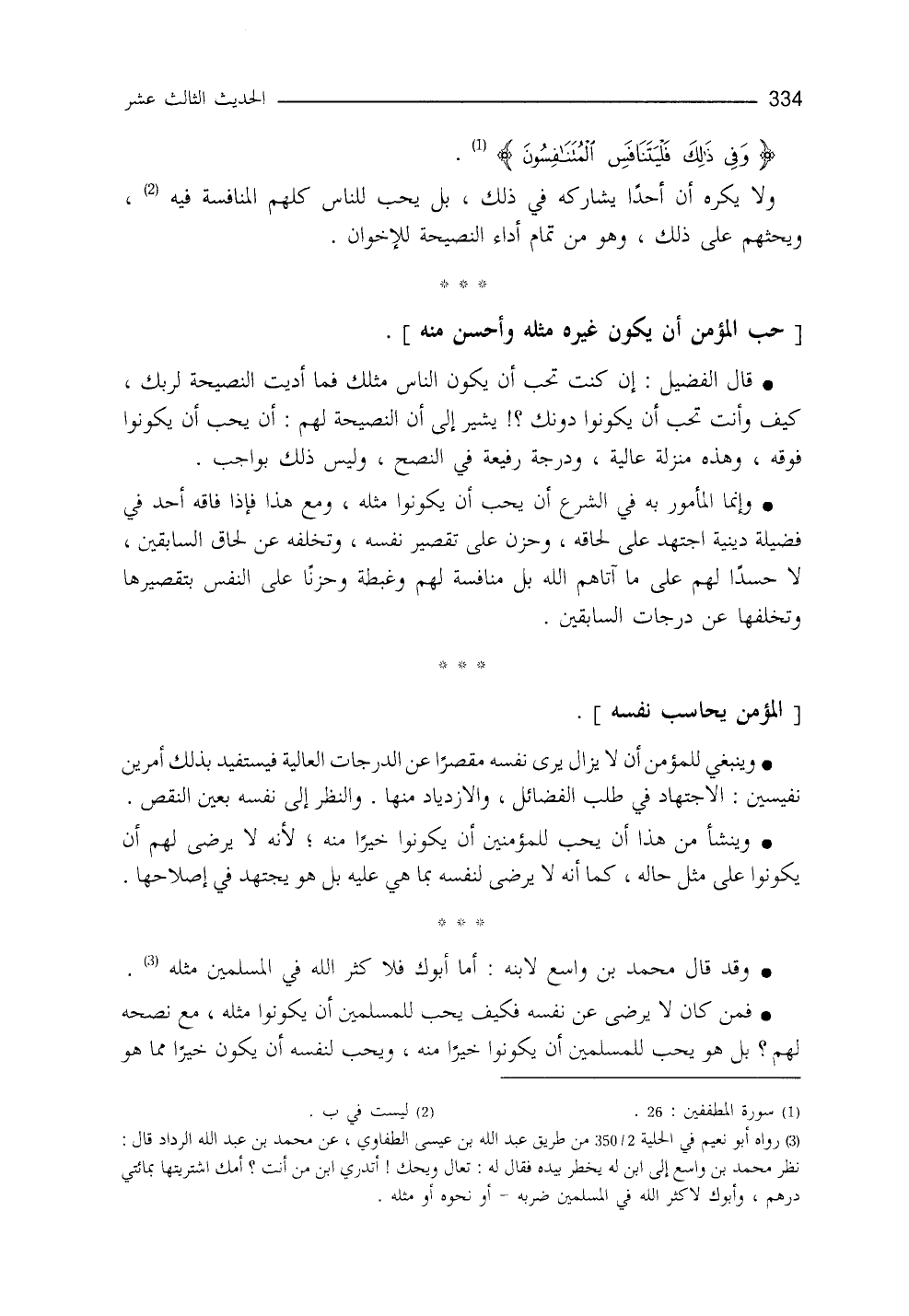 قال الفضيلُ: إنْ كُنتَ تحبُّ أنْ يكونَ الناسُ مثلَك، فما أديتَ النَّصيحة لأخيك (¬3) ، كيف وأنت تحبُّ أنْ يكونوا دونك؟! (¬4) يشير إلى أنَّ أداء النَّصيحة لهم أنْ يُحبَّ (¬5) أنْ يكونوا فوقَه، وهذه منزلةٌ عالية، ودرجةٌ رفيعةٌ في النُّصح، وليس ذَلِكَ بواجبٍ، وإنَّما المأمورُ به في الشرع أنْ يُحبَّ أنْ يكونوا مثلَه، ومع هذا فإذا فاقه أحدٌ في فضيلة دينية اجتهد على لَحاقه، وحزن على تقصير نفسه، وتخلُّفِهِ عن لحاق السابقين، لا حسداً لهم على ما آتاهُم الله من فضله - عز وجل - (¬6) ، بل منافسةً لهم، وغبطةً وحزناً على النَّفس بتقصيرها وتخلُّفها عن درجات السابقين.