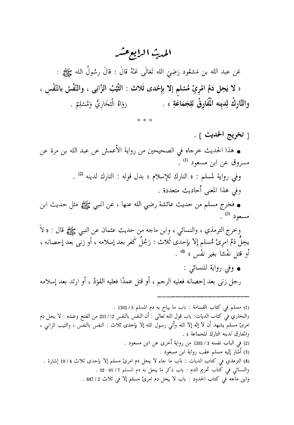 النَّبيِّ - صلى الله عليه وسلم - (¬9) ، قال: ((لا يَحلُّ دمُ امرئٍ مُسلمٍ إلاَّ بإحدى ثلاثٍ: رجلٍ كفر بعد إسلامه، أو زَنى بعد إحصانهِ (¬10) ، أو قتلَ نفساً بغير نفسٍ)) . وفي روايةٍ للنَّسائي