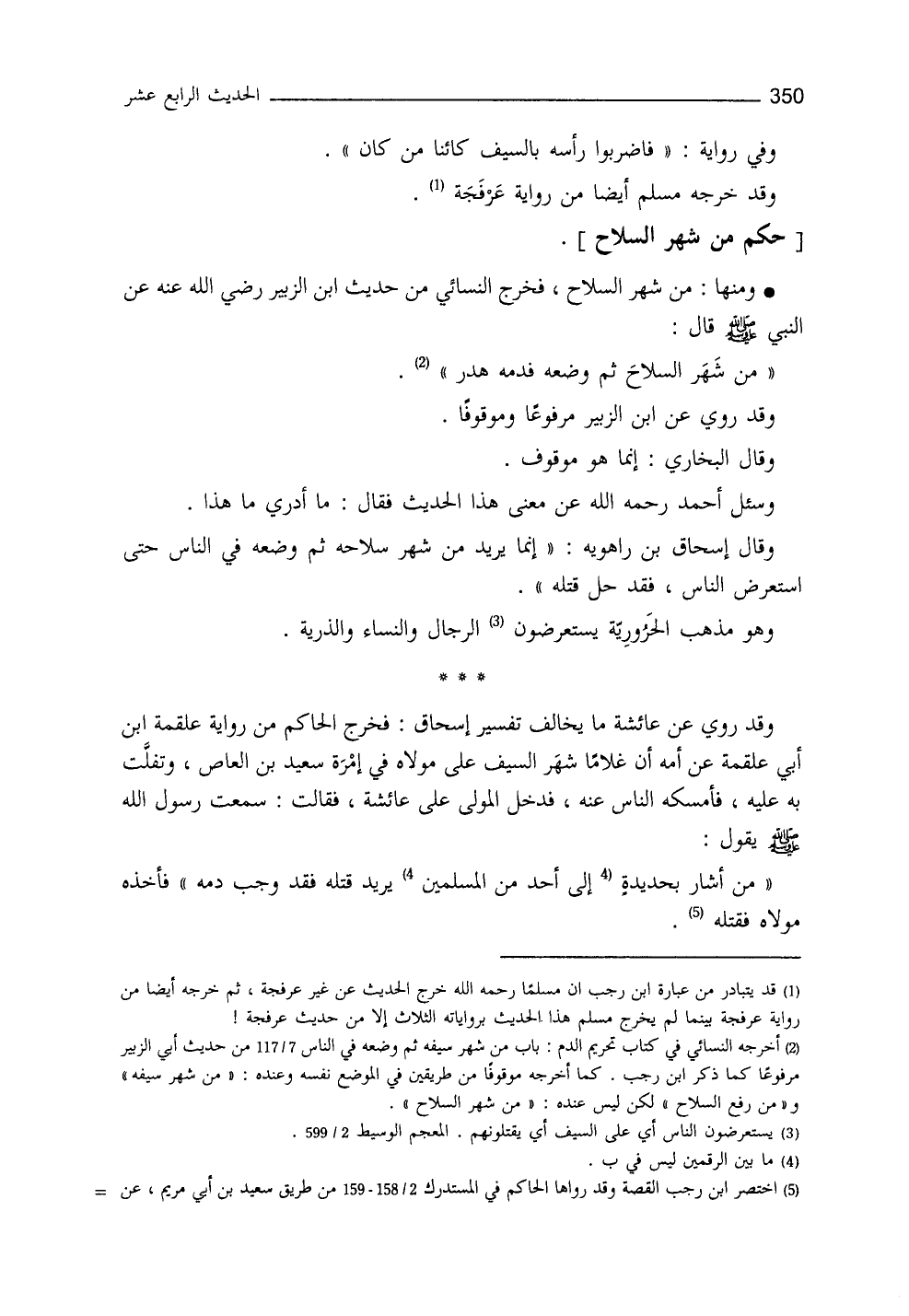 - صلى الله عليه وسلم - قال: ((مَنْ شَهَرَ السِّلاحَ ثم وضعه، فدمه هدرٌ)) ، وقد روي عن ابن الزبير