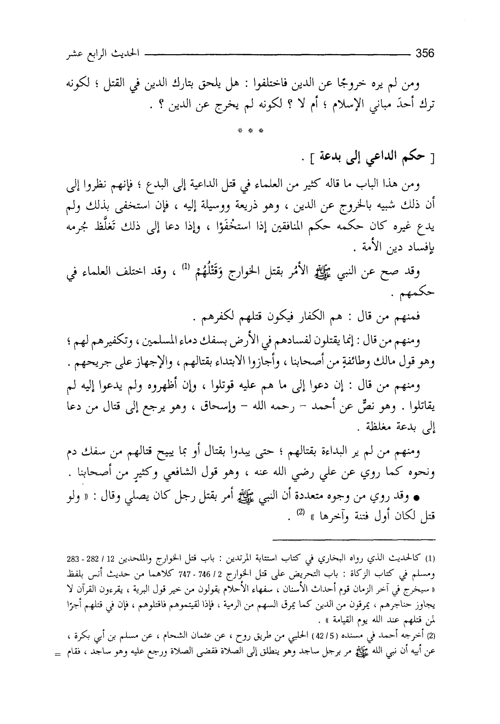 ومِنْ هذا الباب ما قاله كثيرٌ من العلماء في قتل الدَّاعية إلى البدع، فإنَّهم نظروا إلى أنَّ ذلك شبيهٌ بالخروج عَنِ الدِّين، وهو ذريعةٌ ووسيلة إليه، فإن استخفى بذلك ولم يَدْعُ غيرَه، كان حُكمُه حكمَ المنافقين إذا استخفَوا، وإذا دعا إلى ذلك، تَغَلَّظ جرمُه بإفساد دين الأمة (¬1) . وقد صحَّ عن النَّبيِّ - صلى الله عليه وسلم - الأمر بقتال الخوارج وقتلهم (¬2) . وقد اختلف العلماء في حكمهم.
