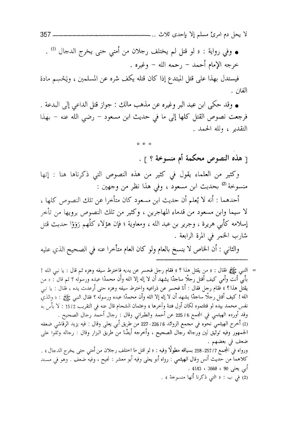فرجعت نصوصُ القتل كلُّها إلى ما في حديث ابن مسعود (¬4) بهذا التقدير، ولله الحمد.