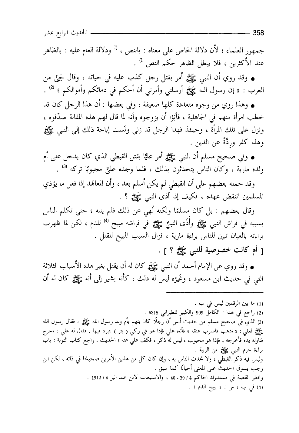 وقد رُوي عن الإمام أحمد: أنَّ النَّبيَّ - صلى الله عليه وسلم - كان له أنْ يَقْتُلَ بغير هذه الأسباب الثلاثة التي في حديث ابن مسعود، وغَيْرُهُ ليس له ذلك، كأنَّه يُشير إلى أنَّه - صلى الله عليه وسلم - كان له أنْ